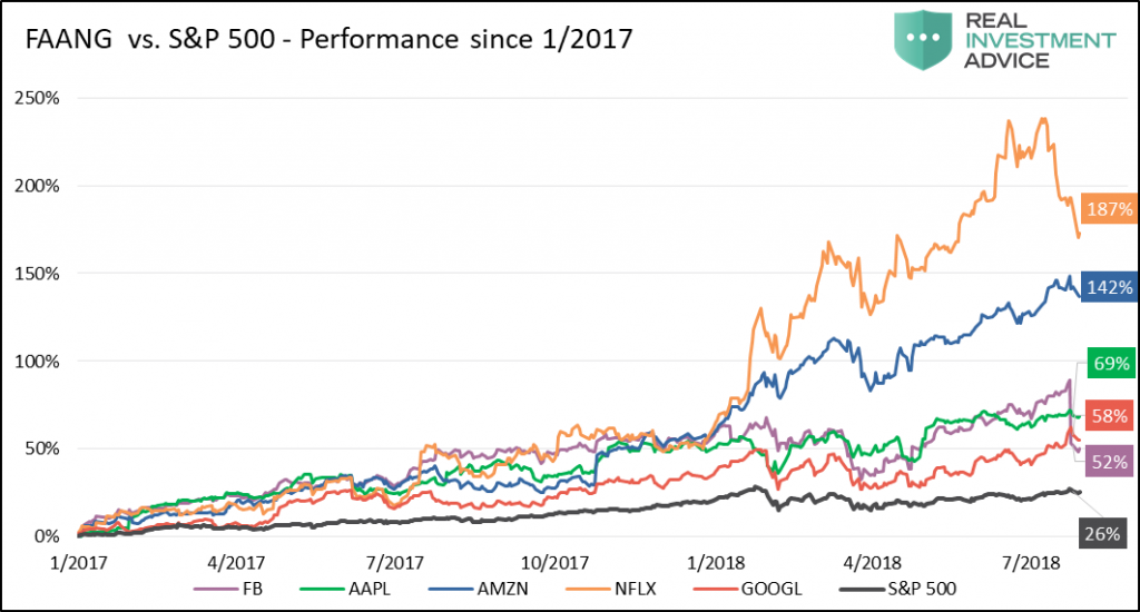 Không có bong bóng nào giống bóng bóng nào. Nếu năm 2007, đó là bong bóng ngành tài chính, thì từ năm 2017 đến nay chính là bong bong bóng công nghệ (TECH). Các bạn thấy rõ từ tháng 1 tới nay và đặc biệt là đầu năm 2018, nhóm FAANG đang chạy nước rút và tạo ra tỷ suất sinh lợi cao hơn nhiều so với thị trường chung.