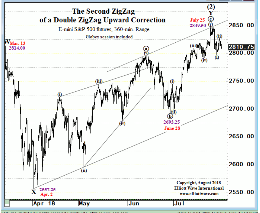 Trên mô hình sóng ELliott của chỉ số S&P500, sóng hiệu chỉnh zigzag W-X-Y đôi đã kết thúc vào ngày 26.7.2018. Đó là điểm kết thúc của sóng (2). Điều này dự báo sự giảm điểm của thị trường chứng khoán Mỹ.