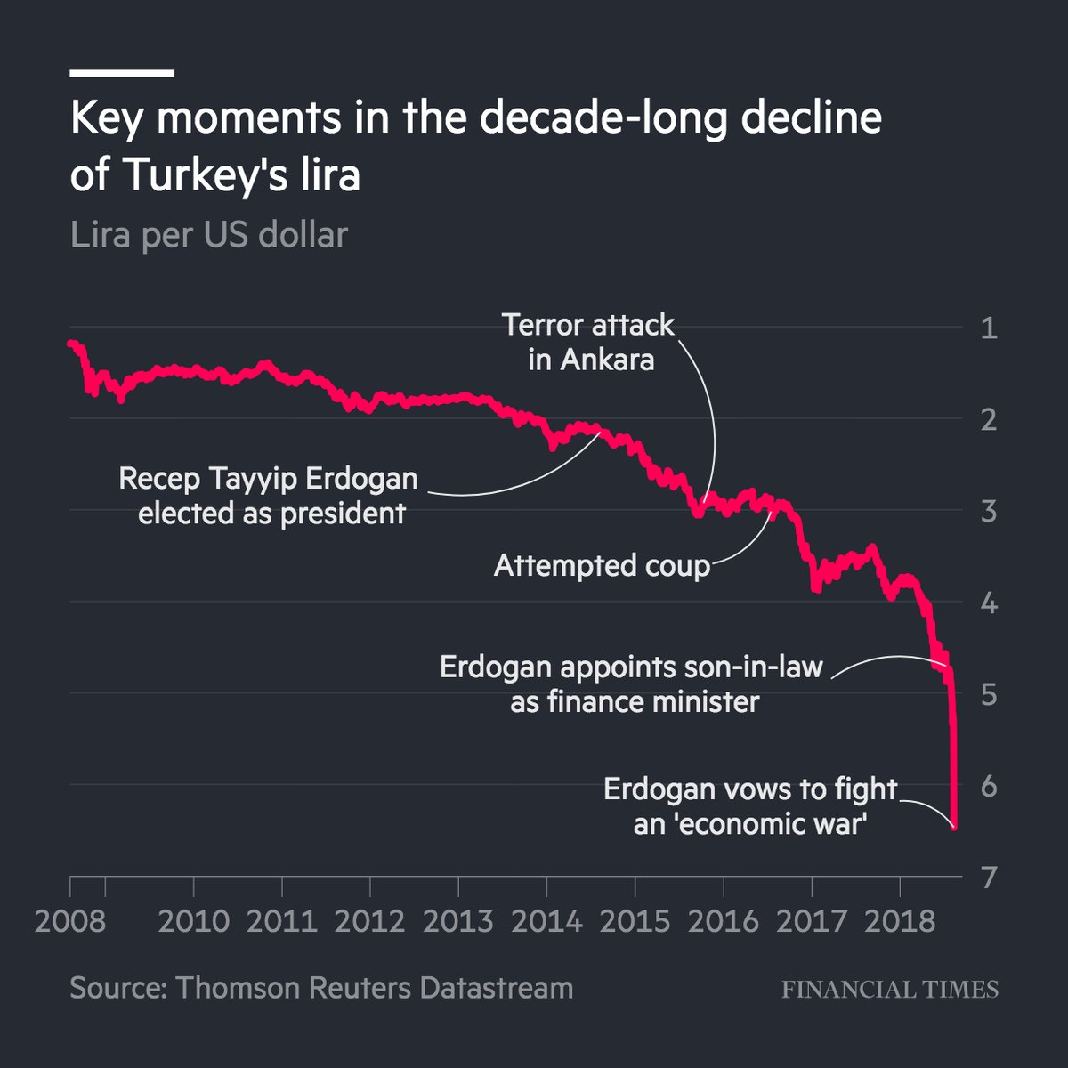 Cuộc khủng hoảng của đồng Lira bắt nguồn từ việc ông Erdogan trở thành Tổng Thống vào tháng 6.2018. Giới đầu tư lo ngại Thổ Nhĩ Kỹ sẽ trở nên căng thẳng hơn với Phương Tây khi ông có nhiều quyền lực hơn. Mặc dù Tổng Thống Erdogan đã nhiều lần lên tiếng hỗ trợ cho đồng Lira nhưng giới đầu tư mất niềm tin vào khả năng lãnh đạo của ông, vào khả năng điều hành của con trai ông trong vai trò bộ trưởng tài chính, và phản ứng của ngân hàng trung ương trong việc tăng lãi suất.”