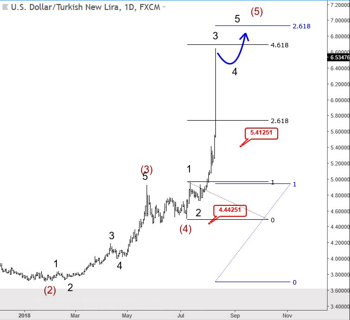 Tỷ giá hiện nay là 1 USD đổi 6.53 đồng Lira. Trên góc nhìn sóng Elliott, khả năng sẽ có sự điều chỉnh nhẹ theo sóng 4 nhưng sau đó sẽ còn tăng trở lại theo sóng 5 để hoàn tất sóng (5). Khả năng sẽ chạm 7 Lira đổi 1 đôla.