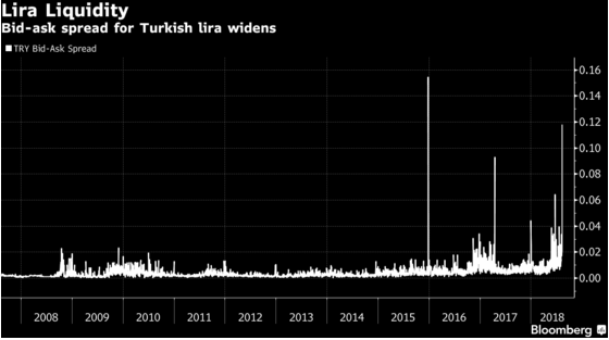 Tình hình cuộc khủng hoảng Thổ Nhĩ Kỳ theo đánh giá của Bloomberg là tệ hơn thời điểm cuộc khủng hoảng của Lehman Brothers, và tương tự với khủng hoảng Đông Á năm 1998. Chi phí giao dịch của đồng Lira tăng mạnh. Chênh lệch giá mua-giá bán (bid-ask spread) của đồng Lira nới rộng hơn nhiều so với cuộc khủng hoảng năm 2008 khi Lehman Brothers sụp đổ, tương đương với khủng hoảng Đông Á 1995 và thấp hơn so với thời điểm phá giá đồng NDT năm 2015.