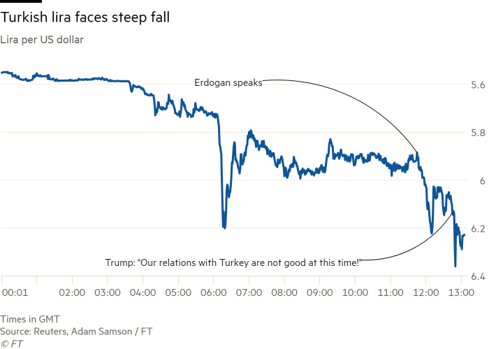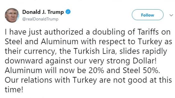 Đầu tiên Tổng Thống Erdogan,nói rằng sẽ sẵn sàng cho “Một cuộc chiến kinh tế (economic wars)” khiến cho đồng Lira rơi nhanh. Sau đó, Tổng Thống lập tức tweet : “Mối quan hệ của chúng ta với Thổ Nhĩ Kỳ lúc nào là không tốt” khiến đồng Lira rơi nhanh hơn nữa. Trong quá khứ, Washington đã từng giúp đỡ Thổ Nhĩ Kỳ ổn định tình hình tài chính nhưng hiện nay hai quốc gia đang căng thẳng bởi việc Thổ Nhĩ Kỳ bắt giữ một mục sư người Mỹ. Thư ký Bộ Thương Mại Mỹ- Wilbur Ross vào tối ngày thứ 6 đã nói: “Mỹ sẽ tăng gấp đôi hàng rào thuế quan đối với thép nhập khẩu từ Thổ Nhĩ Kỹ lên 50%.”