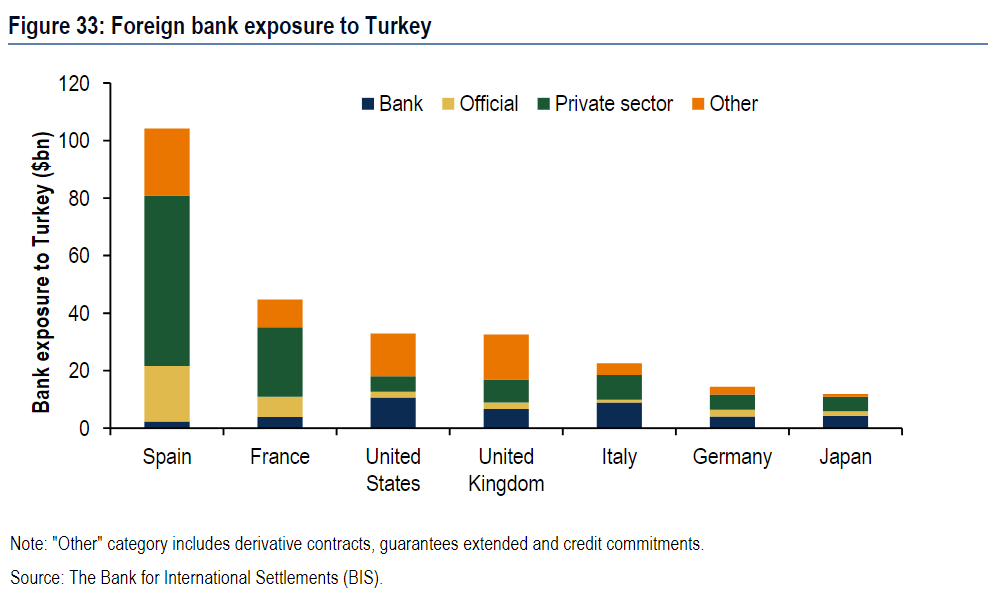 Ba ngân hàng đang có sự hiện diện lớn nhất là BBVA của Tây Ban Nha, UniCredit của Italia, BNP Paribas của Pháp. Các nhà kinh tế đang lo ngại sự lây nhiễm cuộc khủng hoảng Thổ NHĩ Kỳ đến hệ thống ngân hàng Châu Âu và sau đó lan ra toàn cầu.