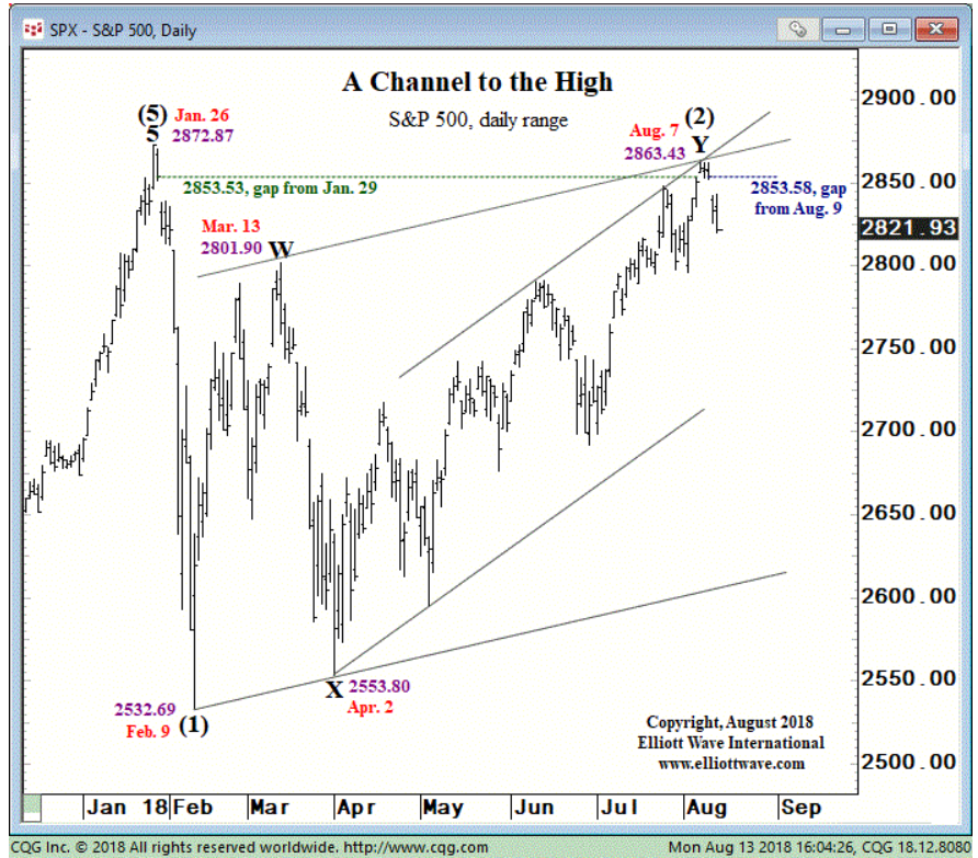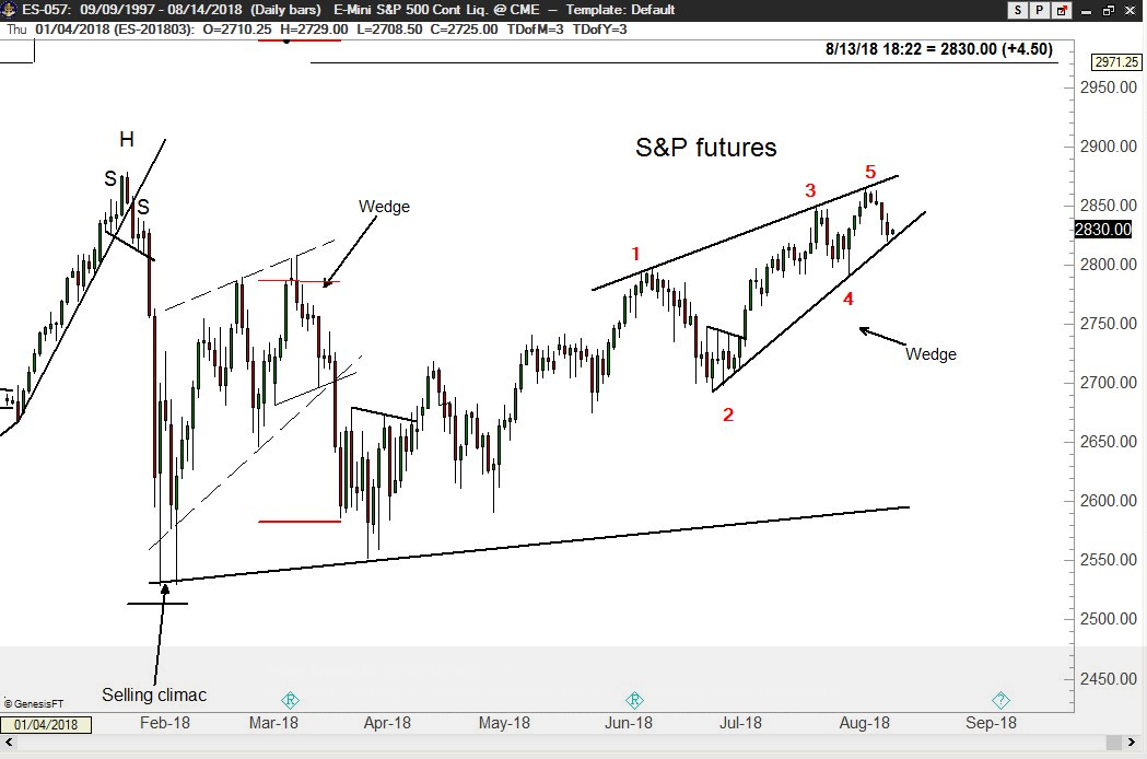 Chỉ số SP500 có 4 phiên giảm điểm liên tiếp sau cuộc khủng hoảng đồng Lira của Thổ Nhĩ Kỳ. Đồ thị dưới phân tích sóng Elliott cho SP500. Chúng ta thấy khoảng trống 29.1.2018 đang tạo ra kháng cự. Đồng thời, đó là sự kháng cự của đường kênh. SP500 đã 5 lần kiểm tra đường kênh trên và thất bại.