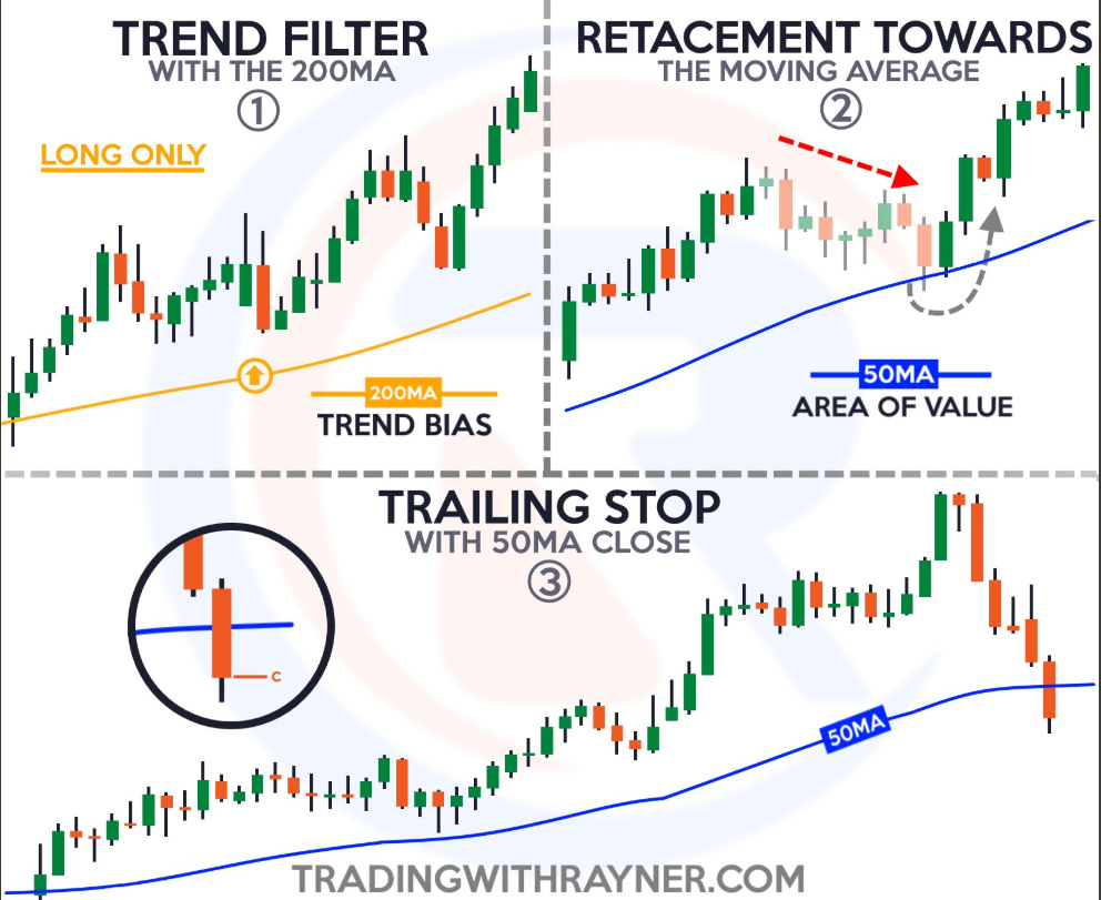 1. Lọc xu hướng (Trend Filter): Nhà giao dịch huyền thoại Paul Tudor Jones nói: “Tôi không mua khi cổ phiếu nằm dưới MA 200 ngày“. Đường MA200 trở thành công cụ lọc xu hướng hiệu quả. Chỉ mua khi giá nằm trên MA200.