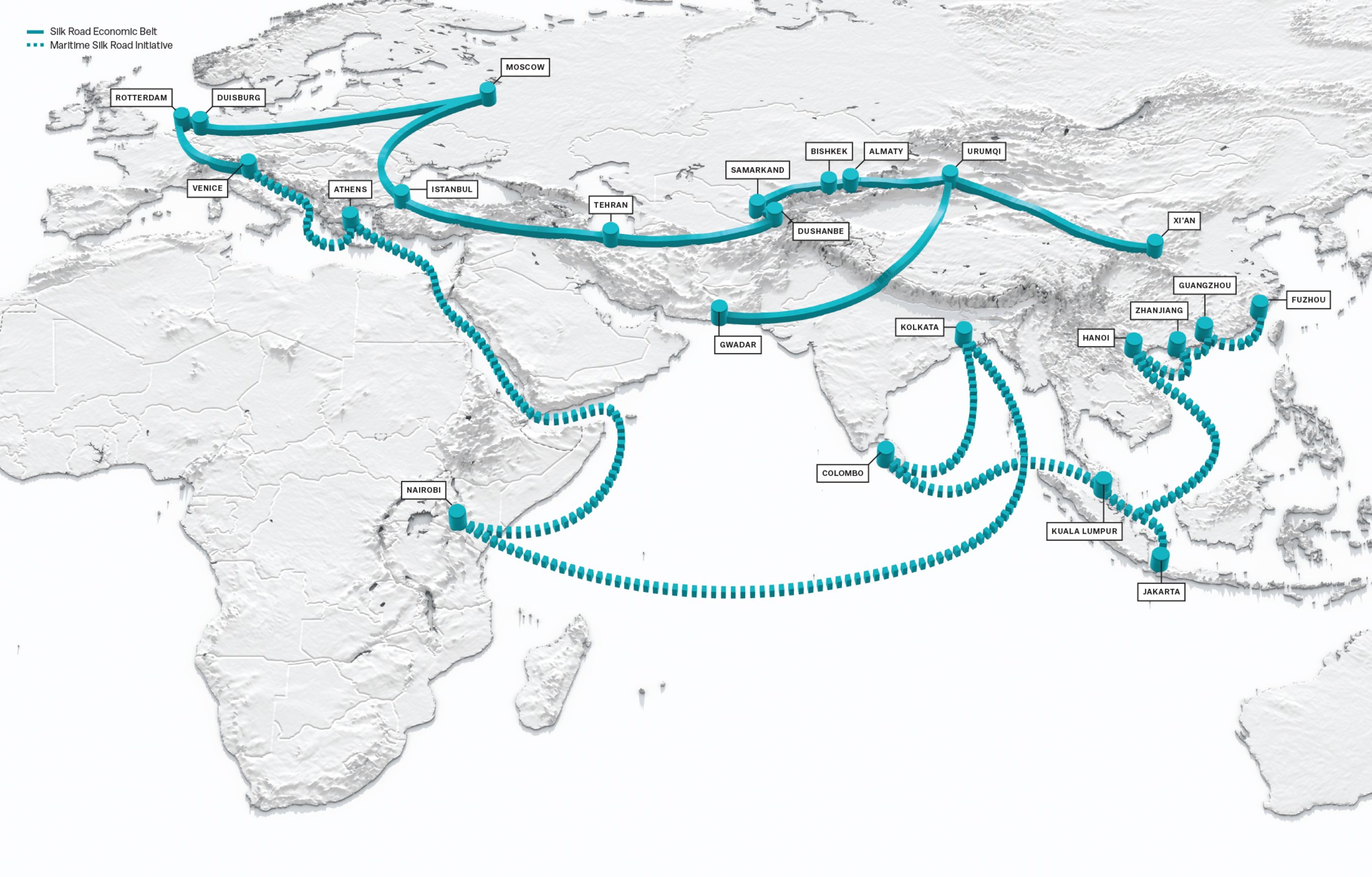 Đến năm 2030, Con Đường Tơ Lụa mới sẽ dài 3,218 km từ Kashgar (Tân Cương, Trung Quốc) đến Cảng Gwadar, Pakistan, là một vị trí chiến lược ở vùng biển Ả Rập khi được bao quanh là các quốc gia nắm 2/3 nguồn cung dầu mỏ thế giới.