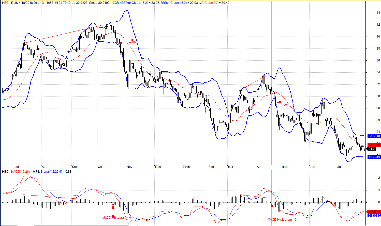 Ví du ở cổ phiếu HBC. Vào tháng 10.2017, giá và MACD Histogram có phân kỳ âm. Sau đó, mặc dù giá thiết lập đỉnh cao mới và chạm dãi băng trên sau đó cắt xuống dãi băng trung tâm, tiếp theo cắt xuống luôn dãi băng dưới, phá vỡ đáy cũ. Đó là lúc MACD Histogrm cắt xuống 0.