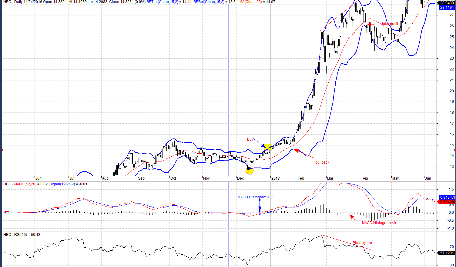 - Từ tháng 10.2016-12.2016, HBC thu hẹp độ biến động khi dãi băng bollinger nén lại (squeeze).