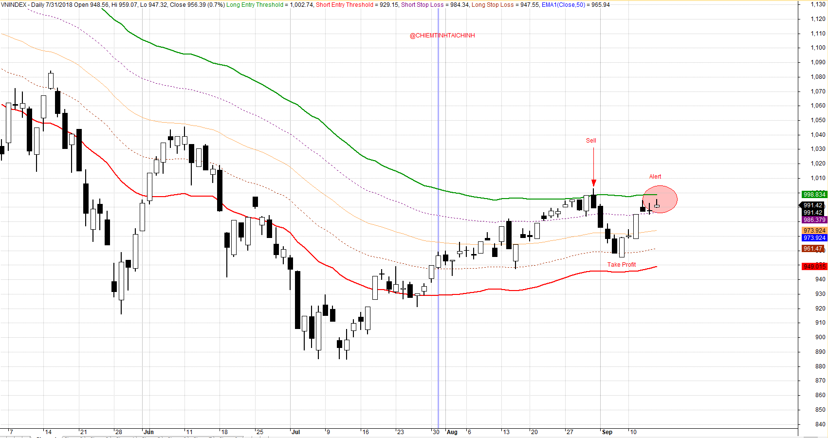 Khi hệ thống kênh ATR nằm ngang, đó là thị trường không có xu hướng và kiểu đánh swing có thể sử dụng. Ngày 31.8.2018, tôi bán khống hợp đồng phái sinh VN30 sau khi nhận thấy giá chạm vào +2ATR của dãi băng và chốt lãi sau 4 phiên khi giá chạm vào -1 ATR. Hiện nay, tôi thấy dấu hiệu cảnh báo khi giá sắp chạm vào +2ATR.