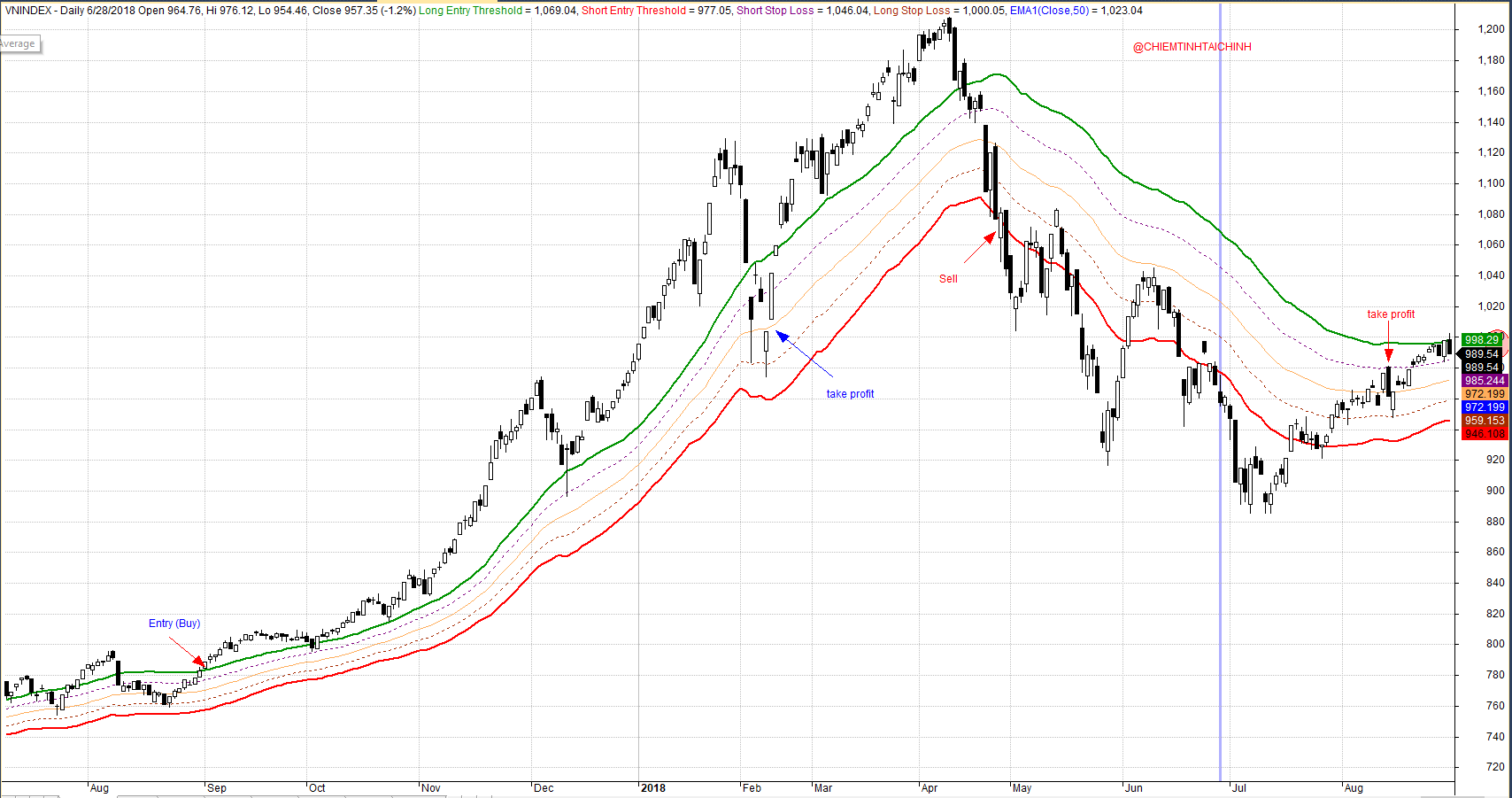 Tiêu chí mua là giá vượt qua +2 ATR so với đường EMA 50, chính là dãi băng màu Green (xanh lá cây).