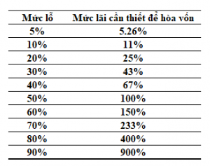 Hãy nhìn vào bảng sau để biết tại sao trader không được phép để mất tiền. Nếu lỗ 50% bạn cần phải lãi 100% mới hòa vốn. Nếu lỗ 90% thì bạn cần phải lãi đến 900% mới hòa vốn.