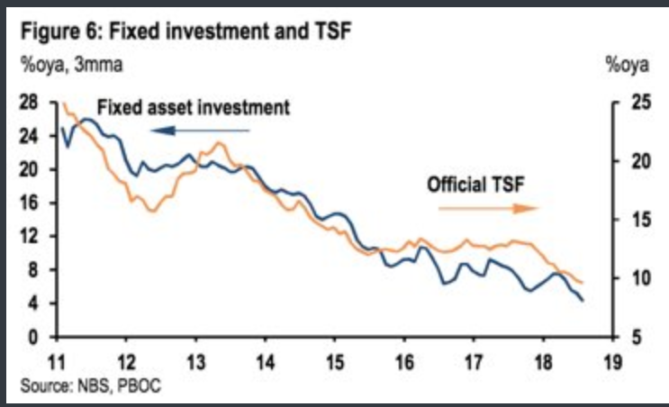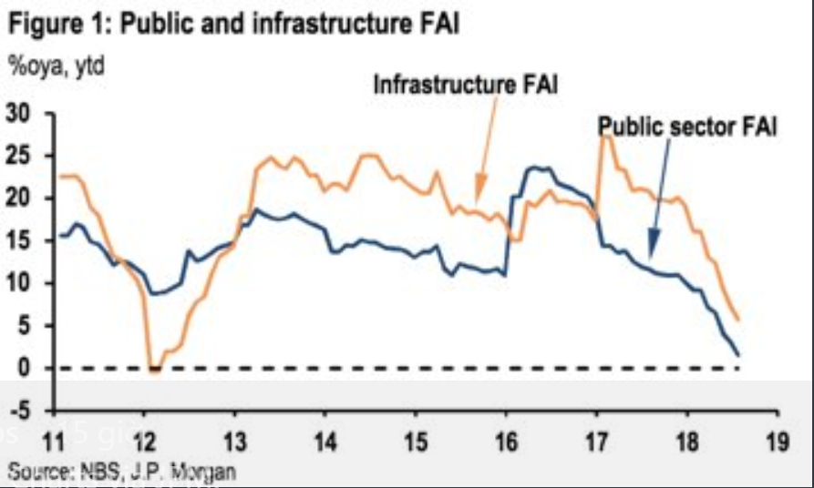 Đầu tư cho cơ sở hạ tầng suy giảm. Chúng ta đã biết, đầu tư cơ sở hạ tầng để giúp chính phủ Trung Quốc tạo nên quả bóng bất động sản và tín dụng khổng lồ. Nhưng từ năm 2016, đầu tư cho cơ sở hạ tâng (infrastructure) sụt giảm mạnh.