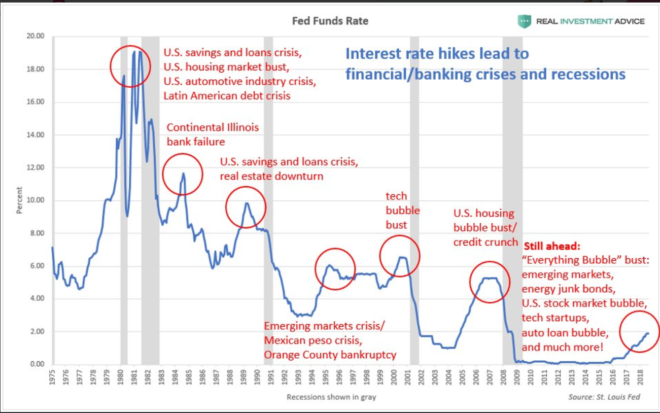 Lịch sử không bao giờ là ánh trăng lừa dối. Đồ thị sau thể hiện diễn biến lãi suất của Fed và các cuộc khủng hoảng.