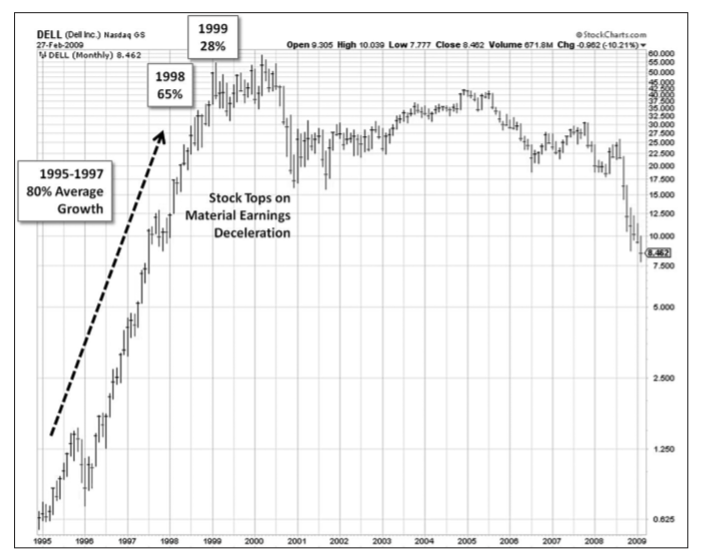 Một công ty vĩ đại với tỷ lệ tăng trưởng hai con số ở mức cao và sau đó giảm xuống còn tăng trưởng hai con số ở mức trung bình là tín hiệu cảnh báo nguy hiểm. Đối với một công ty khác, tăng trưởng 20% hoặc 30% có thể là một bước tiến lớn. Tuy nhiên, đối với một công ty đang tăng trưởng 50%-60% hoặc cao hơn, tốc độ tăng trưởng 20%-30% là một sự sụt giảm nghiêm trọng. Hãy xem điều gì đã xảy ra đối với Dell Computer, vốn có tốc độ tăng trưởng EPS bình quân hàng năm là 80% từ năm 1995 đến 1997, và sau đó giảm xuống còn 65% vào năm 1998 và 28% vào năm 1999. Mặc dù doanh nghiệp vẫn còn đang tăng trưởng khá cao, nhưng đây là sự thay đổi quan trọng và đánh dấu cho sự kết thúc xu hướng tăng giá mạnh mẽ của Dell. Cổ phiếu đạt đỉnh vào năm 2000. 10 năm sau, giá cổ phiếu Dell giảm đến 80% so với đỉnh cao năm 2000.