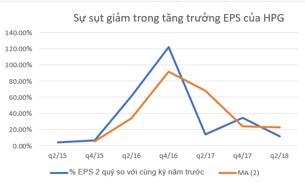 Đồ thị sau mô tả diễn biến tăng trưởng EPS (y-o-y) theo 2 quý so với cùng kỳ năm ngoái của HPG. Chúng ta nhìn thấy sự giảm tốc trong tăng trưởng EPS của Hòa Phát kể từ 2 quý cuối năm 2016 cho đến hiện nay. 2 quý năm 2018 EPS của HPG tăng 11.8%, rất chậm so với mức tăng trưởng 120% của 2 quý cuối năm 2016.