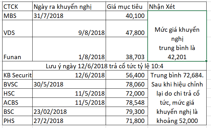 Giá khuyến nghị của các công ty chứng khoán giảm từ mức 52,000 xuống còn khoảng 42,000 ở giai đoạn hiện nay. Mức giá 42,000 cũng gần tương đương với giá hiện tại là khoảng 41,000.