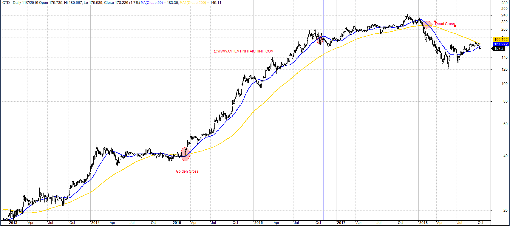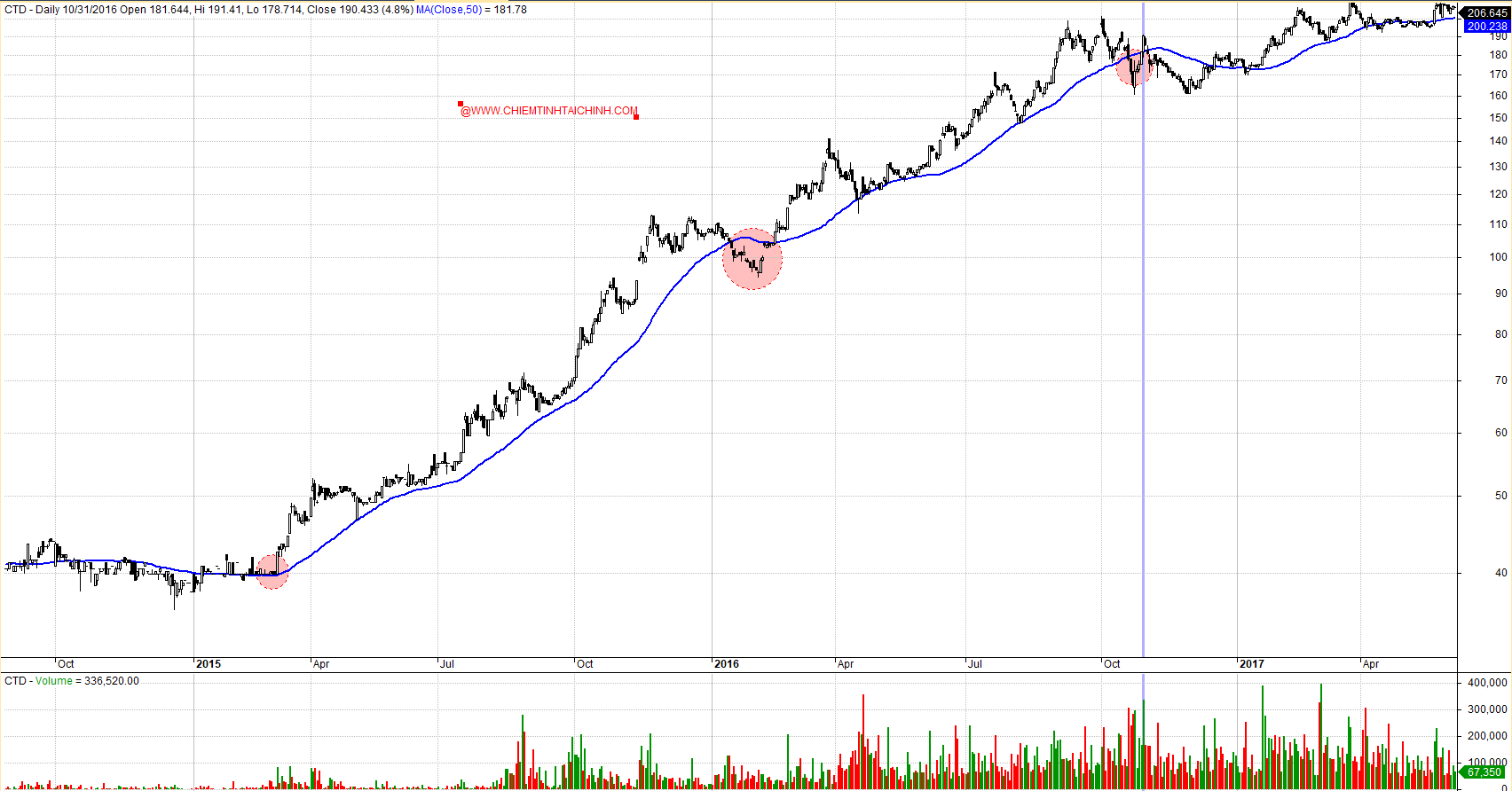 Dưới đây là ví dụ về cổ phiếu CTD. Sau khi vượt lên trên đường MA50 ngày từ tháng 4.2015 tại mức giá 40,000, CTD tăng đến vùng giá 110,000 trước khi đóng cửa dưới đường MA 50 ngày. Sau khi giá lại nằm trên đường MA50 ngày vào tháng 2/2016, CTD lại tiếp tục tăng đến đỉnh 200,000 trước khi giá phá thủng đường MA 50 ngày.