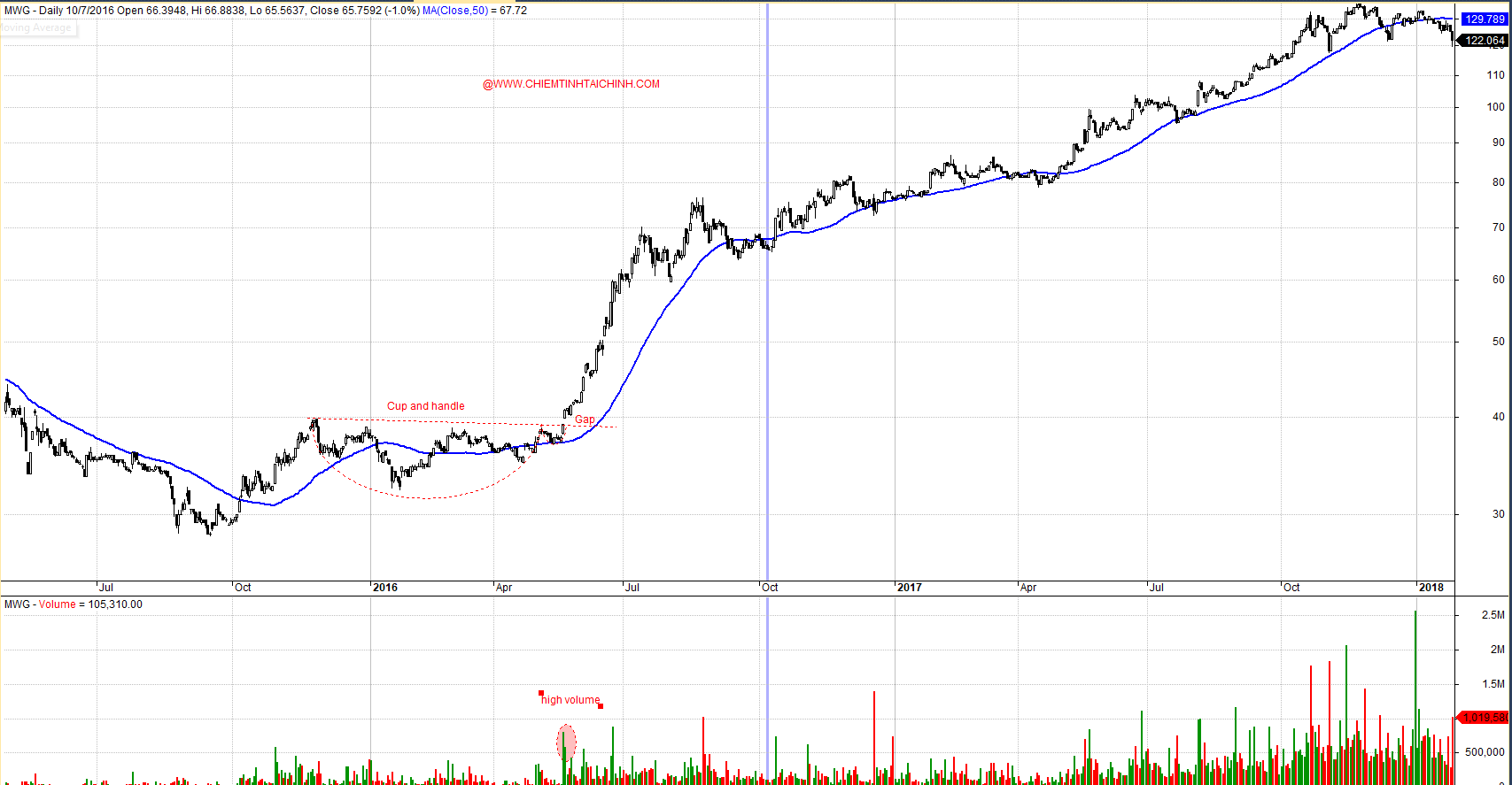 Trở lại với MWG, giá cổ phiếu tăng gấp 3 lần từ 40,000 lên 120,000 sau khi giá tao điểm phá vỡ. Đường MA50 ngày là đường giữ xu hướng tăng rất tốt cho MWG.