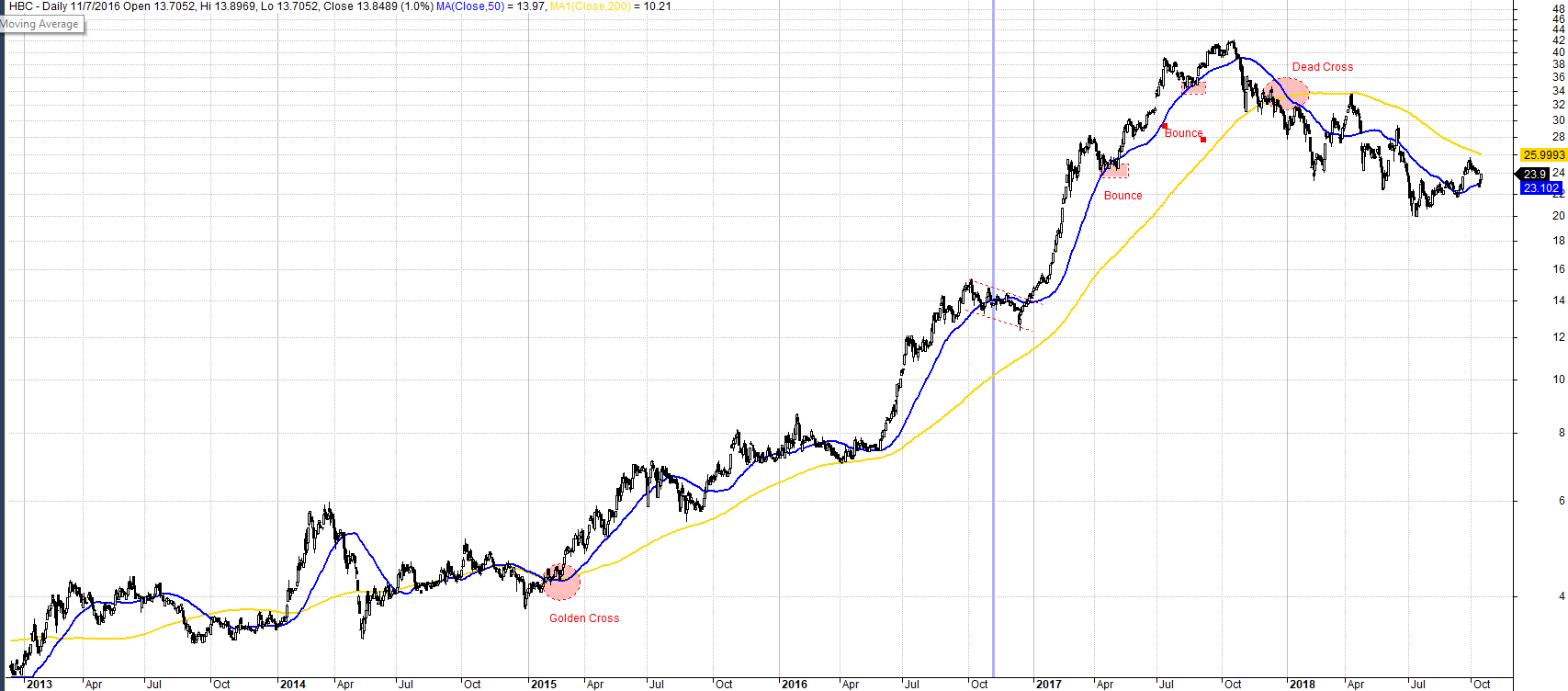 Tương tự đối với HBC. Giá cổ phiếu nhiều lần nảy lên từ đường MA50 ngày. Chỉ cần mua khi giá nằm trên đường MA50 ngày và đóng lệnh khi giá nằm dưới MA50 ngày, bạn cũng đã có lợi nhuận lớn. Chú ý, sự xác nhận xu hướng tăng bởi Giao Cắt Vàng và sự kết thúc xu hướng tăng bởi Chữ Thập Chết Chóc.