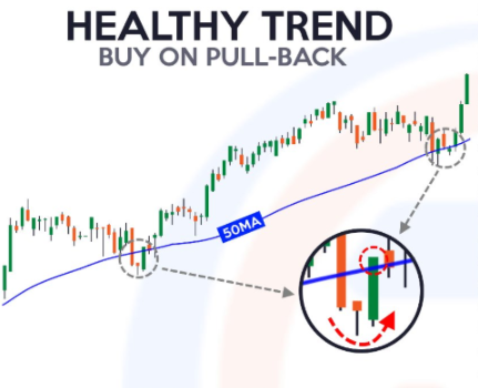 - Nếu giá điều chỉnh và gặp sự hỗ trợ bởi đường MA50 ngày và nảy lên, bạn nên mua. (Nhiều quỹ đầu tư tổ chức thích giải ngân kiểu này)