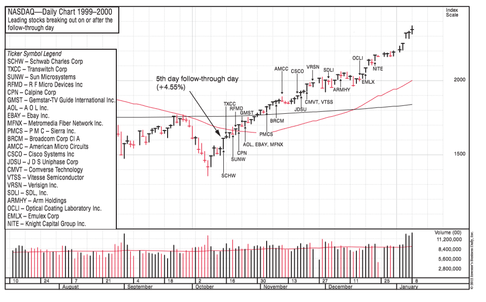 Hình dưới minh họa đáy năm 1999. Nhiều cổ phiếu dẫn dắt xuất hiện sau ngày bùng nổ theo đà ở chỉ số Nasdaq (xuất hiện vào ngày thứ 5). Bạn thấy rằng nhiều cổ phiếu sau đó đã thiết lập đỉnh cao mới sau khi thiết lập điểm phá vỡ từ nền giá tốt. Bạn mua cổ phiếu chứ không phải mua cả thị trường.