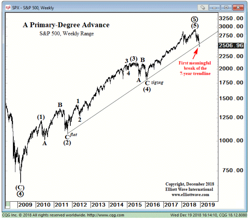 Mô hình sóng Elliott cho thấy, chỉ số SP500 đã phá thủng đường hỗ trợ dài hạn hình thành trong 7 năm.