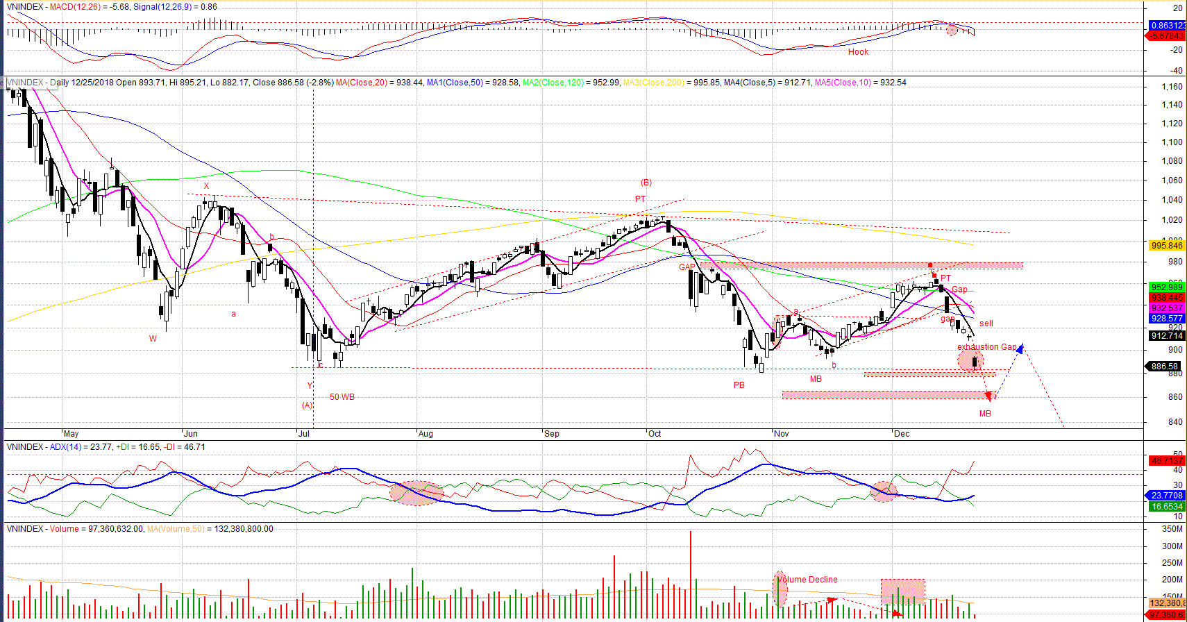 Đồ thị của VN-Index cho thấy khoảng trống thứ ba Exhaution Gap đã xuất hiện, VN-Index sắp tìm thấy hỗ trợ ở 860.