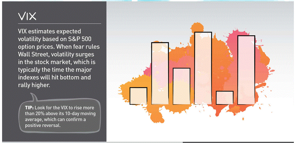 Bí quyết giao dịch: Khi VIX đang nằm ở dưới vùng 20 điểm trong một thời gian dài và bất ngờ tăng vọt đó là dấu hiệu thị trường tạo lập đỉnh. Khi chạm mức 40 thường đánh dấu bắt đầu một thị trường con gấu lớn.