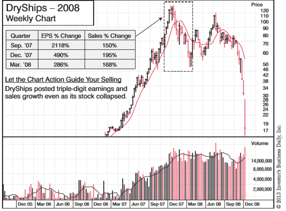 DryShips là ví dụ điển hình. Mặc dù công ty vẫn công bố tăng trưởng doanh số và lợi nhuận lên đến ba con số nhưng các nhà đầu tổ chức vẫn đang bán tháo cổ phiếu, khiến cho cổ phiếu này rơi vào xu hướng giảm. Điều gì sẽ xảy ra với các nhà đầu tư “đã cưới” cổ phiếu này, khi họ cảm thấy “yêu” lợi nhuận lớn của nó? Họ chắc chắn sẽ kiên trì bám chặt cổ phiếu này, bên nhau từ lúc “giàu sang” ở đỉnh $130 cho đến lúc “nghèo khó” ở mức giá $2 trong suốt 5 năm trời. Điều này giúp mọi người hiểu ra tầm quan trọng của việc giới hạn khoản lỗ không được phép vượt quá 7%-8%.