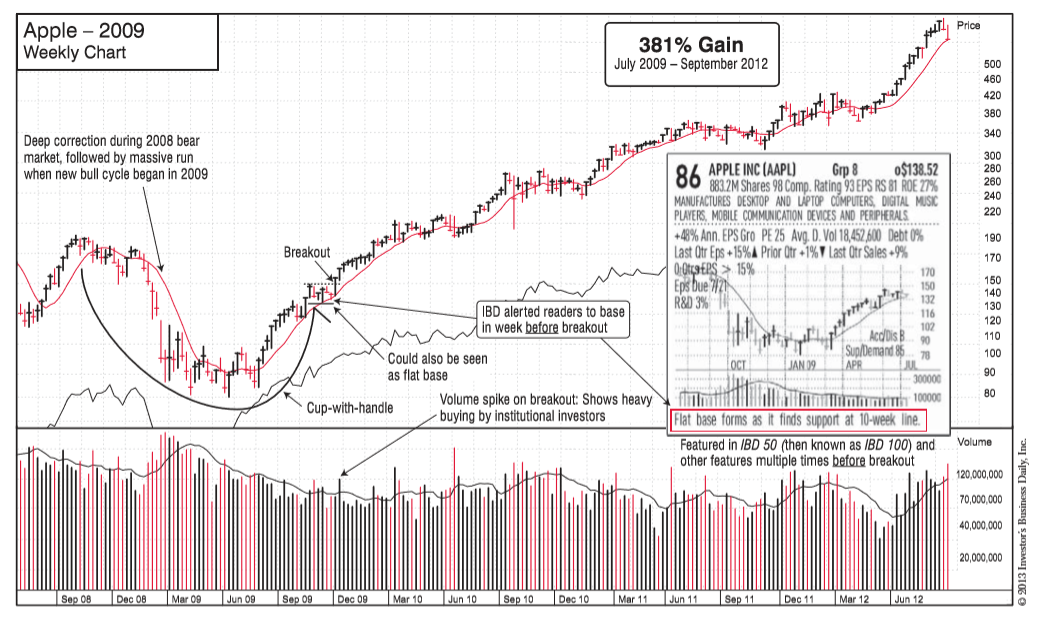 Lợi nhuận lớn chỉ dành cho những ai kiên nhẫn. Hãy nhìn lại bài học của AAPL (Apple) vào năm 2009. Apple đóng vai trò cổ phiếu dẫn dắt khi tăng 381% từ tháng 7/2009 đến tháng 9/2012. Ba quý trước tháng 7.2009, Số lượng các quỹ đầu tư sở hữu cổ phiếu Apple lần lượt tăng như sau: 286 --> 316 --> 321. (Cho đến khi Apple đạt đỉnh vào năm 2012, có tới hơn 4,300 quỹ đầu tư sở hữu cổ phiếu này.)