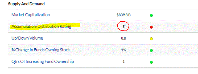 Là người theo dõi thường xuyên Nhật Báo IBD, từ tháng 11.2018, khi APPL vừa phá thủng đường MA10 tuần, Nhật Báo IBD đã công bố xếp hạng Tích Lũy/Phân Phối (Accumulation/Distribution Rating) của APPL ở mức E