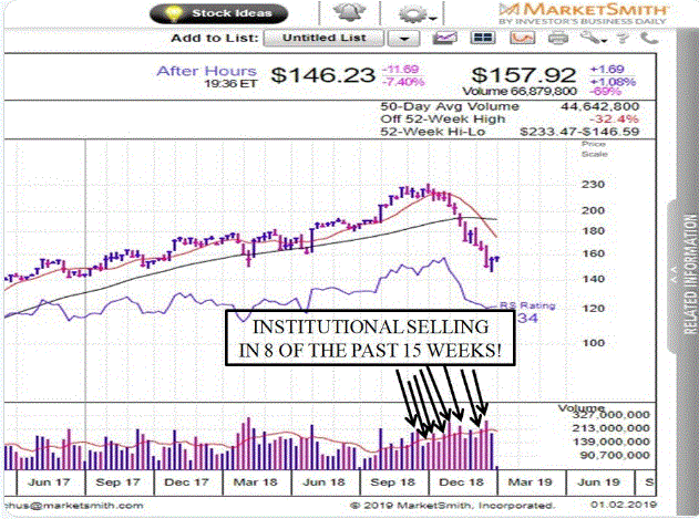 Vào thời điểm tôi viết bài này, APPLE đang là cổ phiếu gây sự chú ý khi giảm tới gần 40% từ đỉnh cao nhất. Đồ thị dưới cho thấy các lực bán tháo của nhà đầu tư tổ chức khi giá thủng MA10 tuần với khối lượng tăng dần.