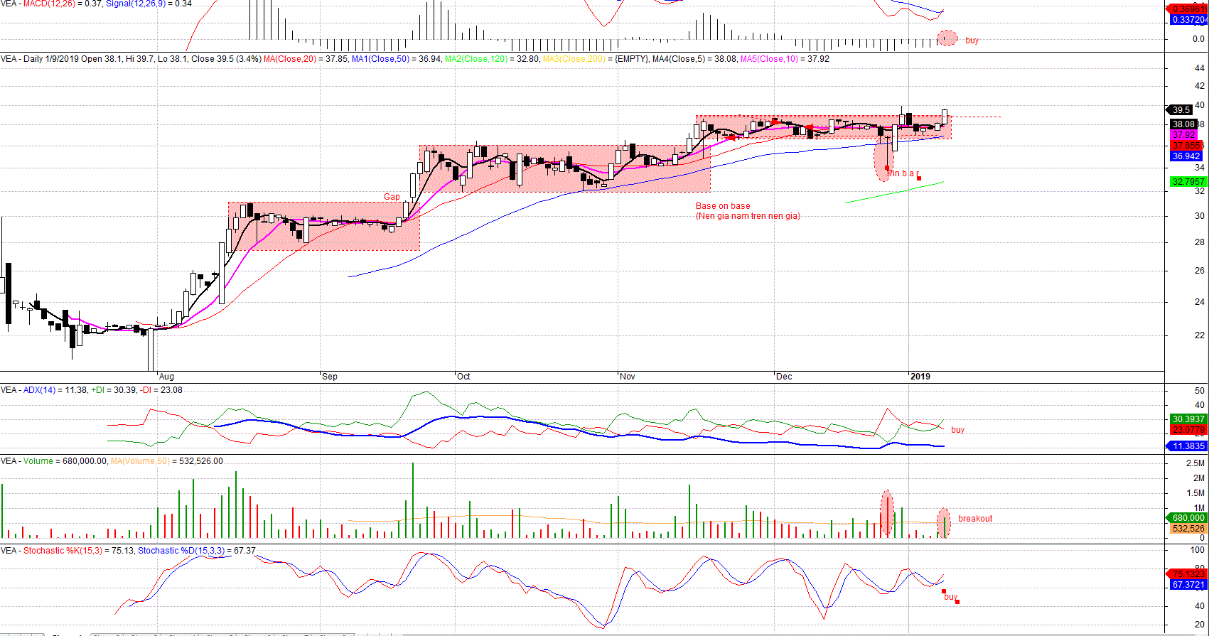 Phiên giao dịch ngày 9/1/2019, VEA xuất hiện điểm phá vỡ (breakout) từ mẫu hình ba nền giá chồng trên nhau (base-on-base). Chi tiết cách giao dịch theo mẫu hình nền giá chồng trên nền giá được hướng dẫn cụ thể trong cuốn sách “How To Make Money In Stock (Làm Giàu Từ Chứng Khoán)” của William O’Neil.