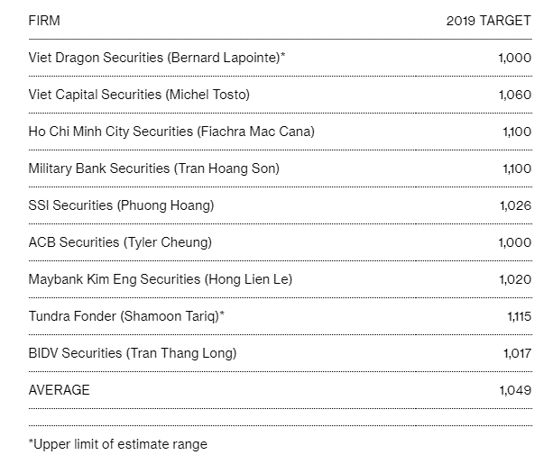 Theo 9 nhà phân tích, nhà đầu tư và chiến lược gia được phỏng vấn bởi Bloomberg, chỉ số VN-Index có thể đạt mức 1,049 điểm vào cuối tháng 12/2019, tức tăng 18%. Vào tháng 2.2018, điều tra của Bloomberg cho thấy những nhà quan sát thị trường này kỳ vọng chỉ số VN-Index tăng 23% trong năm 2018. Nhưng thực tế lại kết thúc hoàn toàn trái ngược khi chỉ số VN-Index giảm 9.3%.