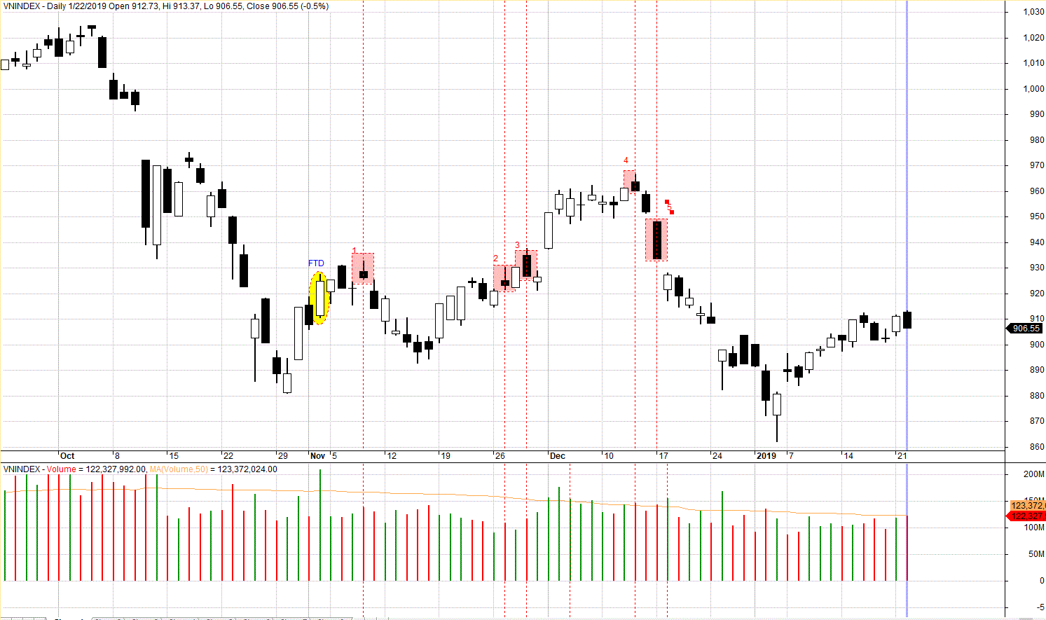 Như bạn thấy trường hợp của VN-Index trong đợt tăng từ ngày 30/10/2018 đến ngày 13/12/2018. Các ngày phân phối 1, 2 và 3 xuất hiện ngay ở trong xu hướng tăng. Đến ngày phân phối thứ 5, tín hiệu bán xuất hiện và VN-Index quay trở lại xu hướng giảm.