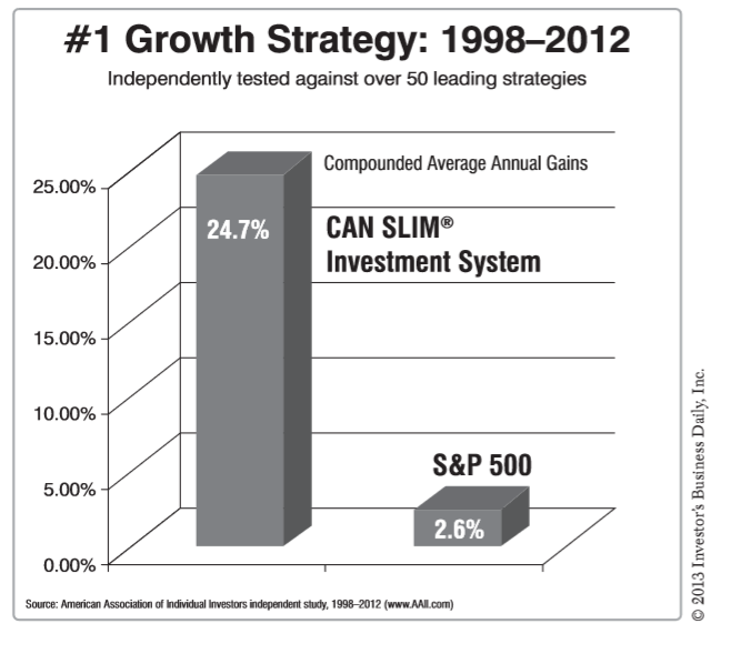 Từ năm 1998, hiệp hội AAII đã tiến hành một nghiên cứu lâu dài về 50 chiến lược đầu tư hàng đầu. Theo đó, trong giai đoạn 1998-2012, hiệp hội AAII đã phát hiện Hệ Thống Đầu Tư CANSLIM là chiến lược tăng trưởng sinh lợi nhất, với tỷ suất sinh lợi hàng năm là 24.7%.