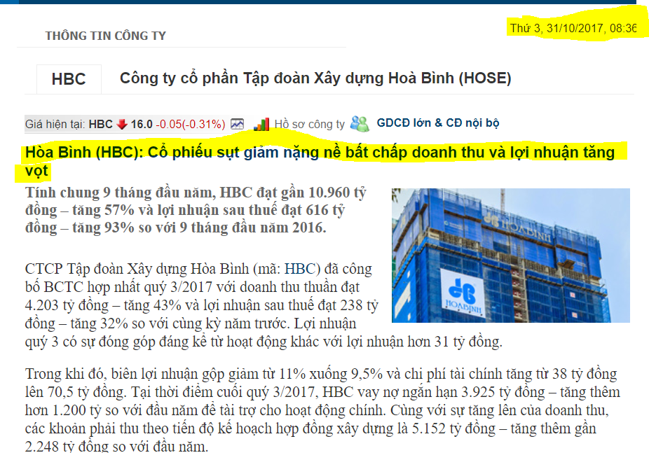 Đây chính là trường hợp của HBC. Vào ngày 31.7.2017, HBC công bố lợi nhuận quý 2 tăng 129%, Ngày 31/10/2017, báo cáo lợi nhuận quý 3 tăng 32%