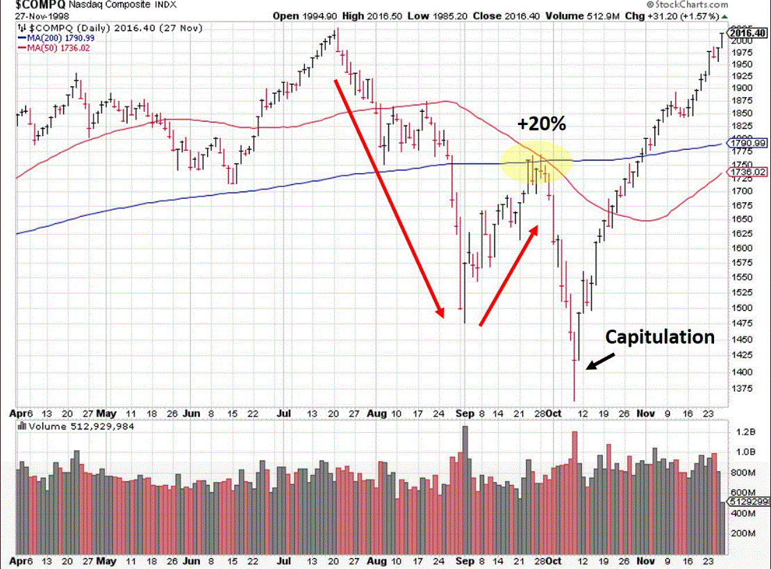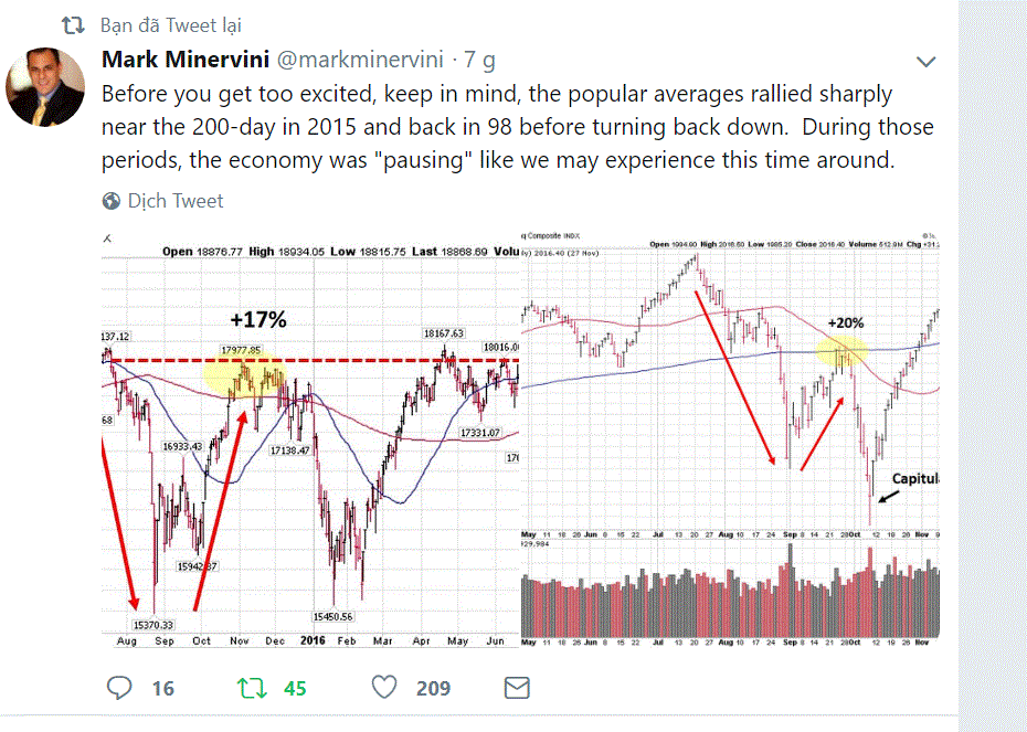Phù thủy Mark Minervini cảnh báo: “Trước khi bạn cảm thấy quá hưng phấn, hãy nhớ, các chỉ số thị trường từng hồi phục rất nhanh đến đường MA 200 ngày vào năm 2016 và năm 1998, trước khi quay trở lai xu hướng giảm.”