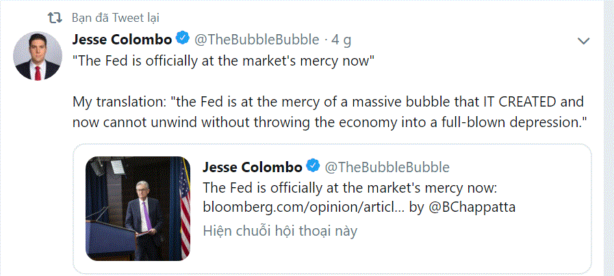 Nhà kinh tế học tôi ưa thích nhất, Jesse Colombo (người dự báo chính xác cú sập đổ vào tháng 10,2018 của TTCK) giải thích quyết định kiên nhẫn của Fed như sau: