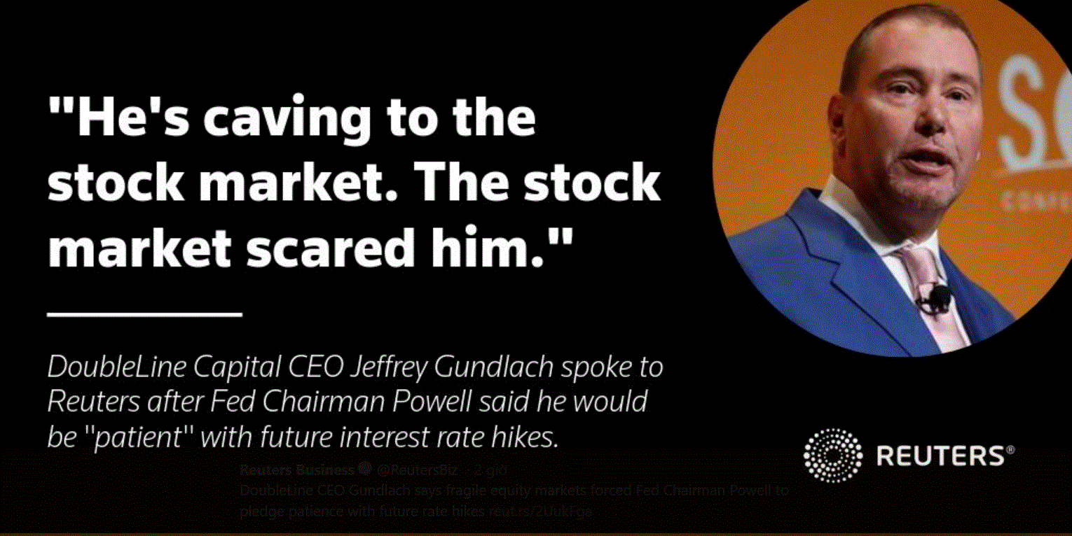 CEO Gundlach của DoubleLine nói với Reuters: “Chính sự yếu ớt, mong manh dễ vỡ của thị trường cổ phiếu buộc Powell phải kiên nhẫn trong việc tăng lãi suất”. Ông kết luận: “Powell đã đánh sập thị trường. Và thị trường chứng khoán đã khiến ông ấy sợ hãi”