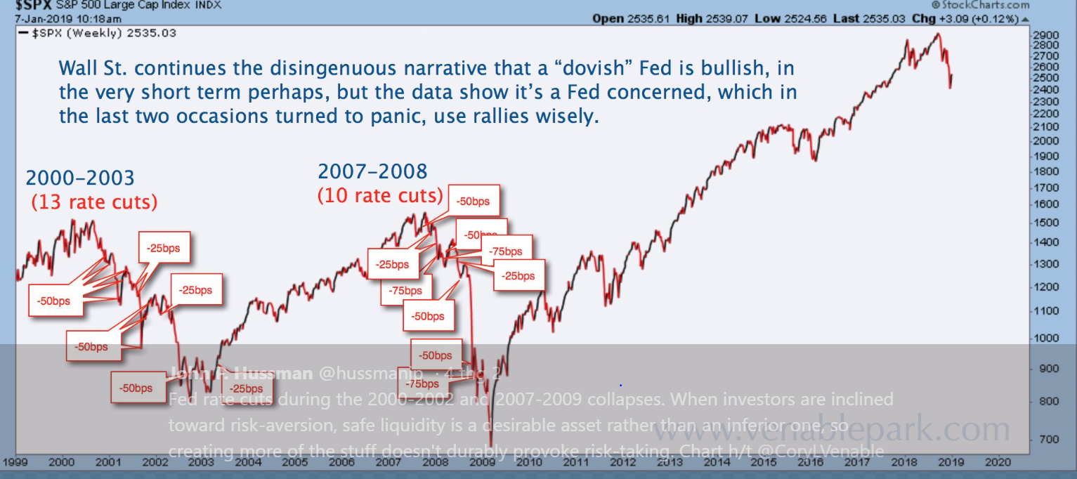 Ngay cả khi Fed hạ lãi suất trong năm 2000 và 2007, cũng không thể cứu nổi SP500.