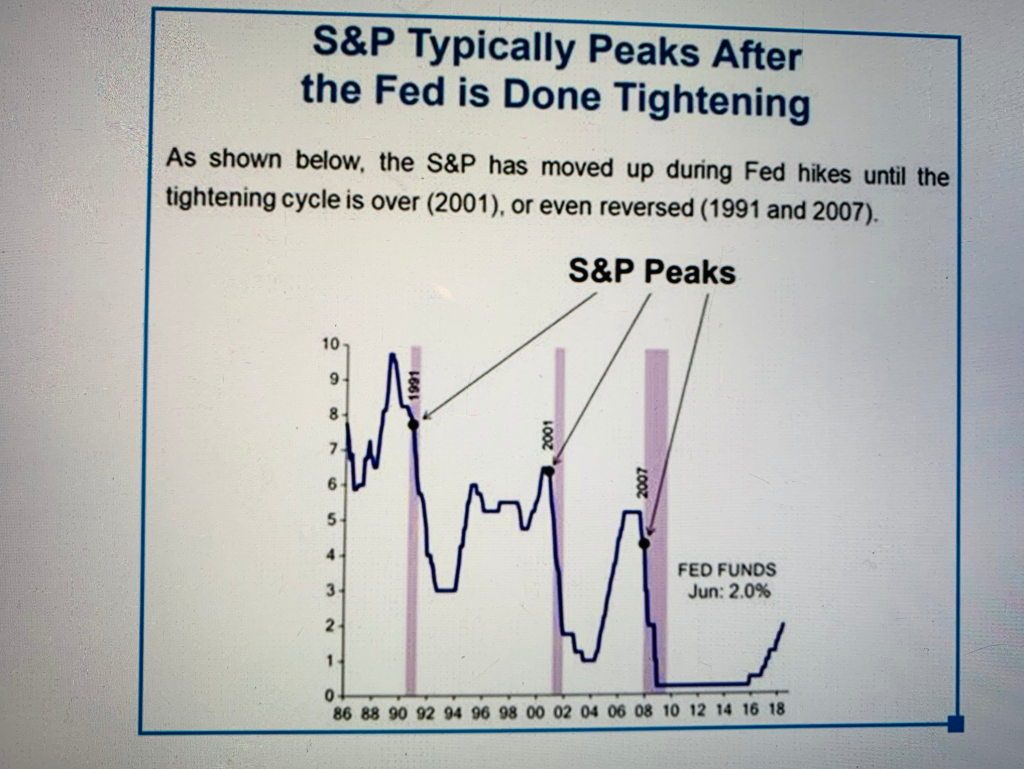 Chúng ta có thể quan sát lại lịch sử để có thêm hiểu biết về hành động hiện nay của FED. Hình dưới cho thấy, chỉ số S&P500 tăng trong khi Fed tăng lãi suất. Nhưng đến khi Fed ngừng tăng lãi suất, S&P500 bắt đầu đạt đỉnh.