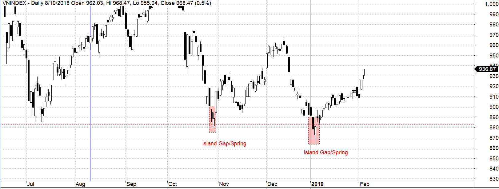 Ví dụ, đợt phục hồi của VN-Index tại đáy 4.1.2019 chính là một cú Spring bằng mẫu hình nến Island Gap (đảo chiều ốc đảo)