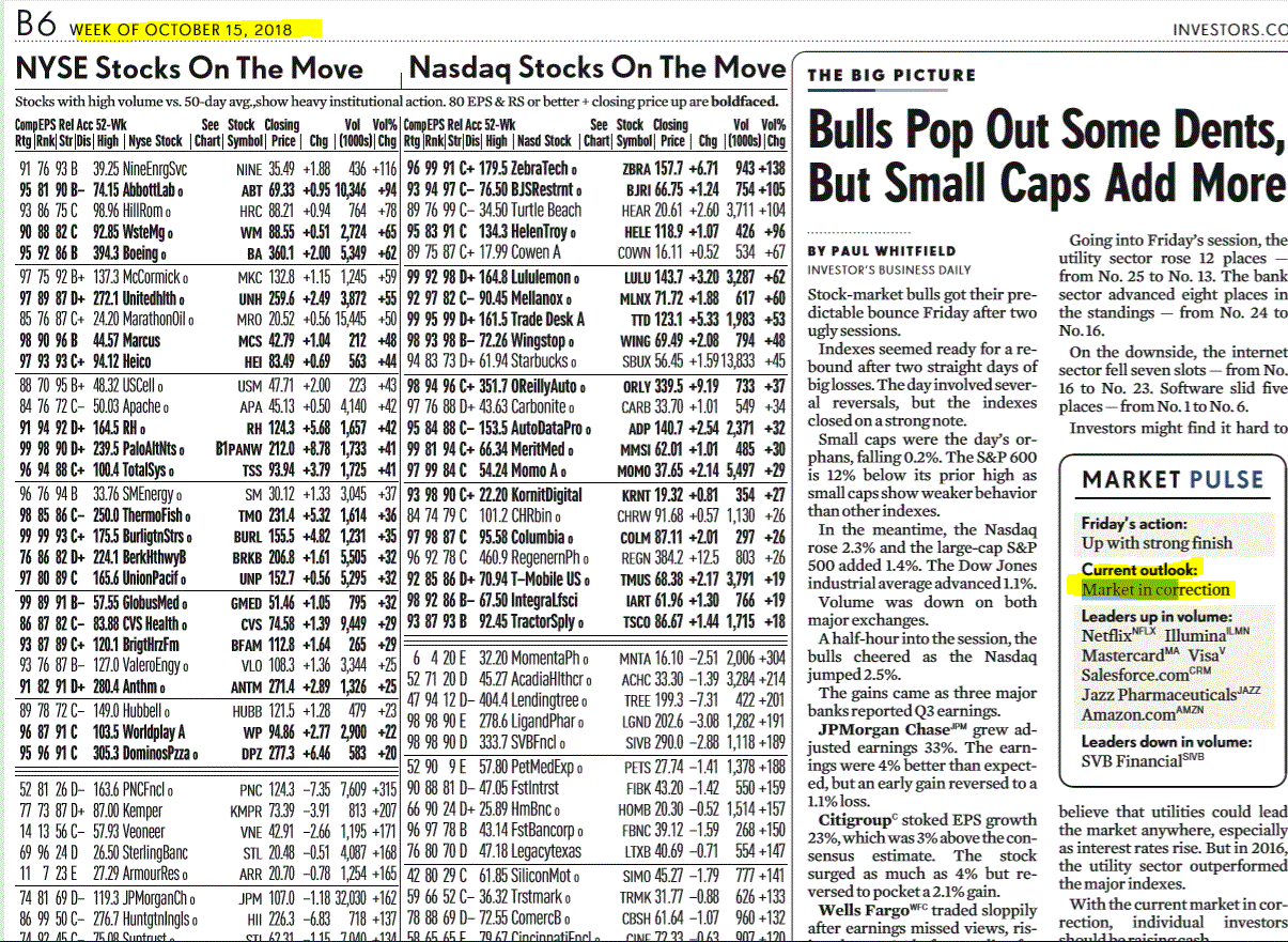 Một phần rất quan trọng của chiếc hộp Nhịp Đập Thị Trường (Market Pulse) là số ngày phân phối. Nên nhớ rằng, số ngày phân phối xuất hiện ngay cả trong khi thị trường tăng giá và đó lý do tại sao rất ít nhà đầu tư chú ý đến nó. Vào đầu tháng 10.2018, Nhật Báo IBD đã cảnh báo thị trường: “Đang ở Trong Xu Hướng Giảm (Market in Correction)”.