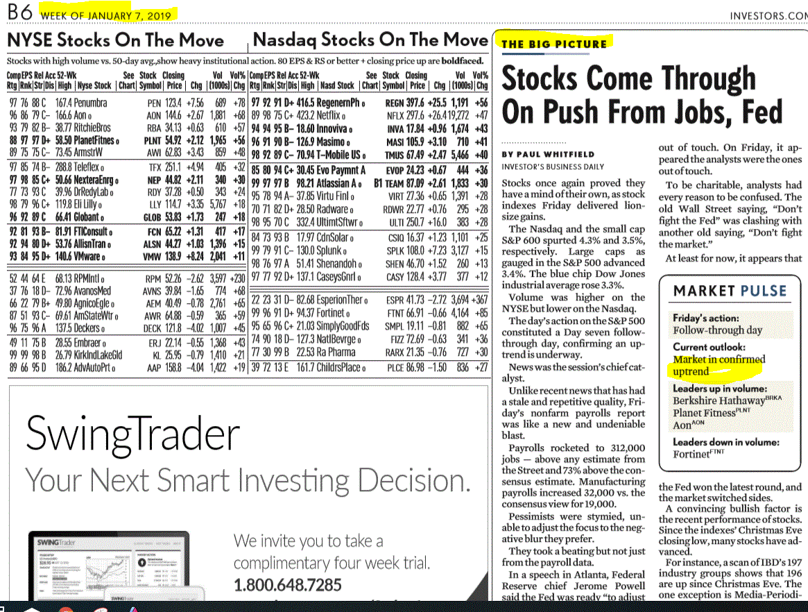 Như vậy, Nhật Báo IBD số ra ngày 7/1/2019 đã ghi nhận dòng chữ: “Confirmed Uptrend: Xu Hướng Tăng Được Xác Nhận”. Vâng tôi đã sớm chuyển tải thông tin này đến nhà đầu tư Việt Nam qua bài viết