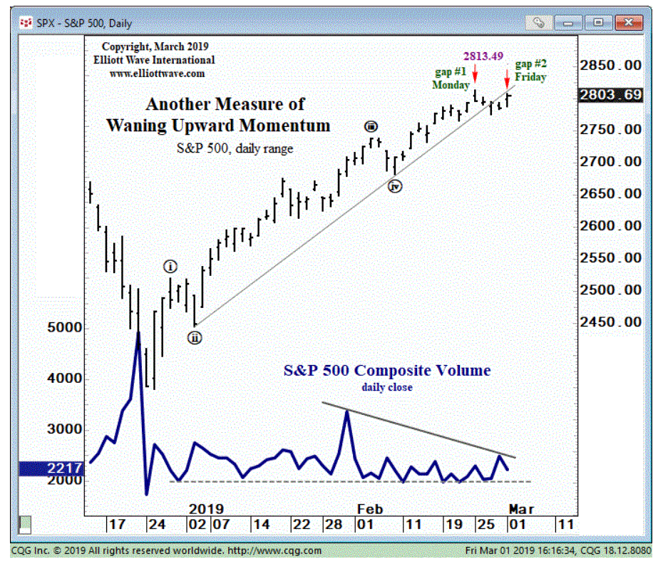 Không chỉ Nhật Báo IBD, EWI cũng đang cảnh báo bạn đọc về việc chỉ số SP500 đang mất Momemtum. Với hai khoảng trống giá đang xuất hiện và SP500 đang ở test đường trendline nối sóng ii và sóng iv, nhà đầu tư nên cẩn trọng với khả năng kết thúc sóng 2 tăng giá và chuyển sang sóng 3 giảm giá.