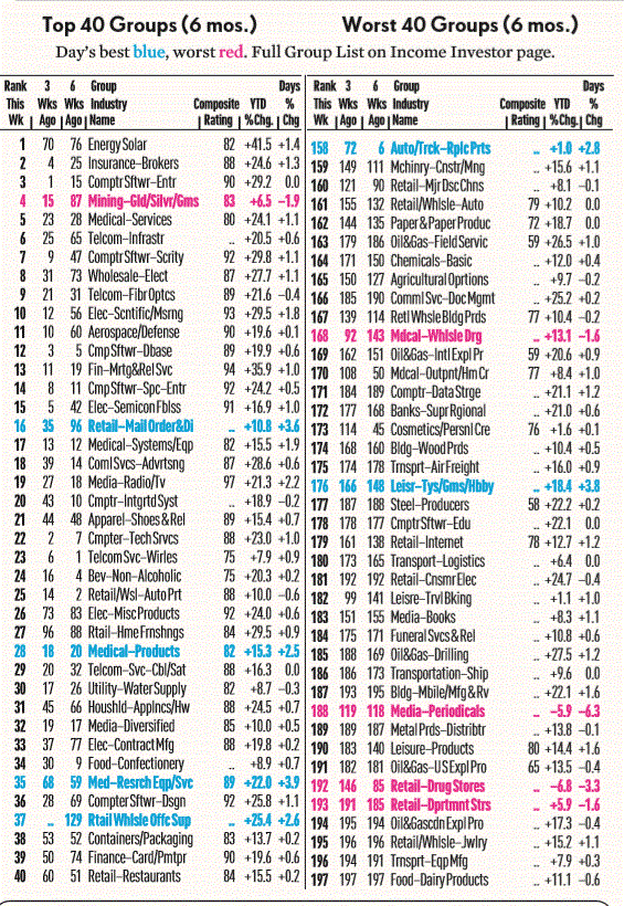 197 nhóm ngành công nghiệp được đề cập ở trên có thể tìm thấy trong các số ra hàng ngày của Nhật Báo IBD. Chúng tôi đã phân hạng mỗi tiểu nhóm dựa trên biến động giá trong 6 tháng để bạn có thể dễ dàng nhận ra tiểu nhóm nào đang là những ngành dẫn sóng thực sự. Những người mua hoạt động theo tôn chỉ “mua cổ phiếu định giá thấp” thường thích mua các nhóm ngành có thành tích giá tệ nhất. Nhưng nghiên cứu của chúng tôi cho thấy, các cổ phiếu nằm trong 50 hoặc 100 nhóm ngành tăng giá tốt nhất thường hoạt động tốt hơn so với 100 nhóm ngành có thành tích giá tệ nhất. Vì thế, để tăng khả năng thành công của bạn, hãy tập trung vào những cổ phiếu tăng giá tốt nhất trong 20 nhóm ngành tăng giá tốt nhất và hãy tránh xa 20 nhóm có thành tích giá tệ nhất.