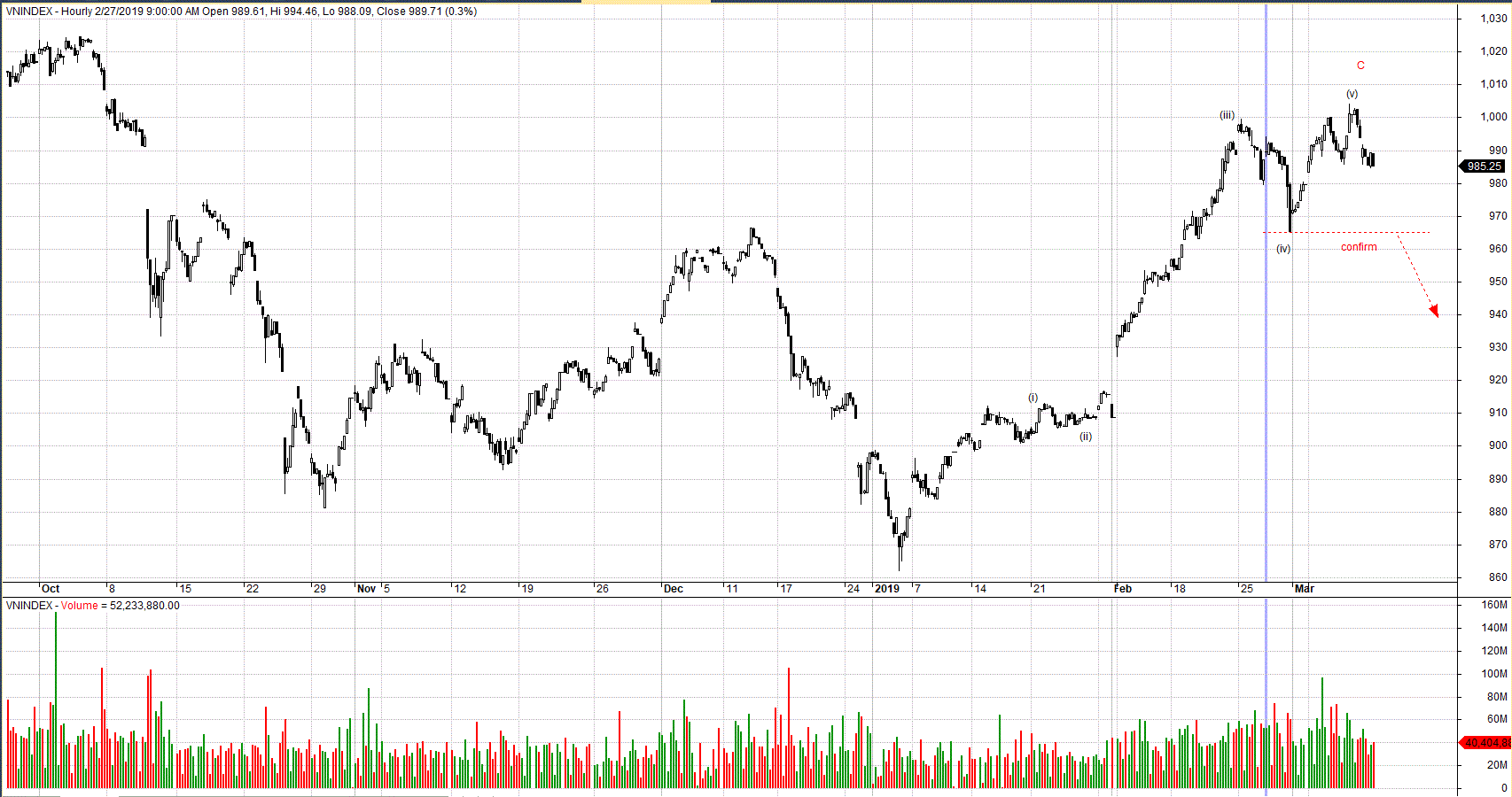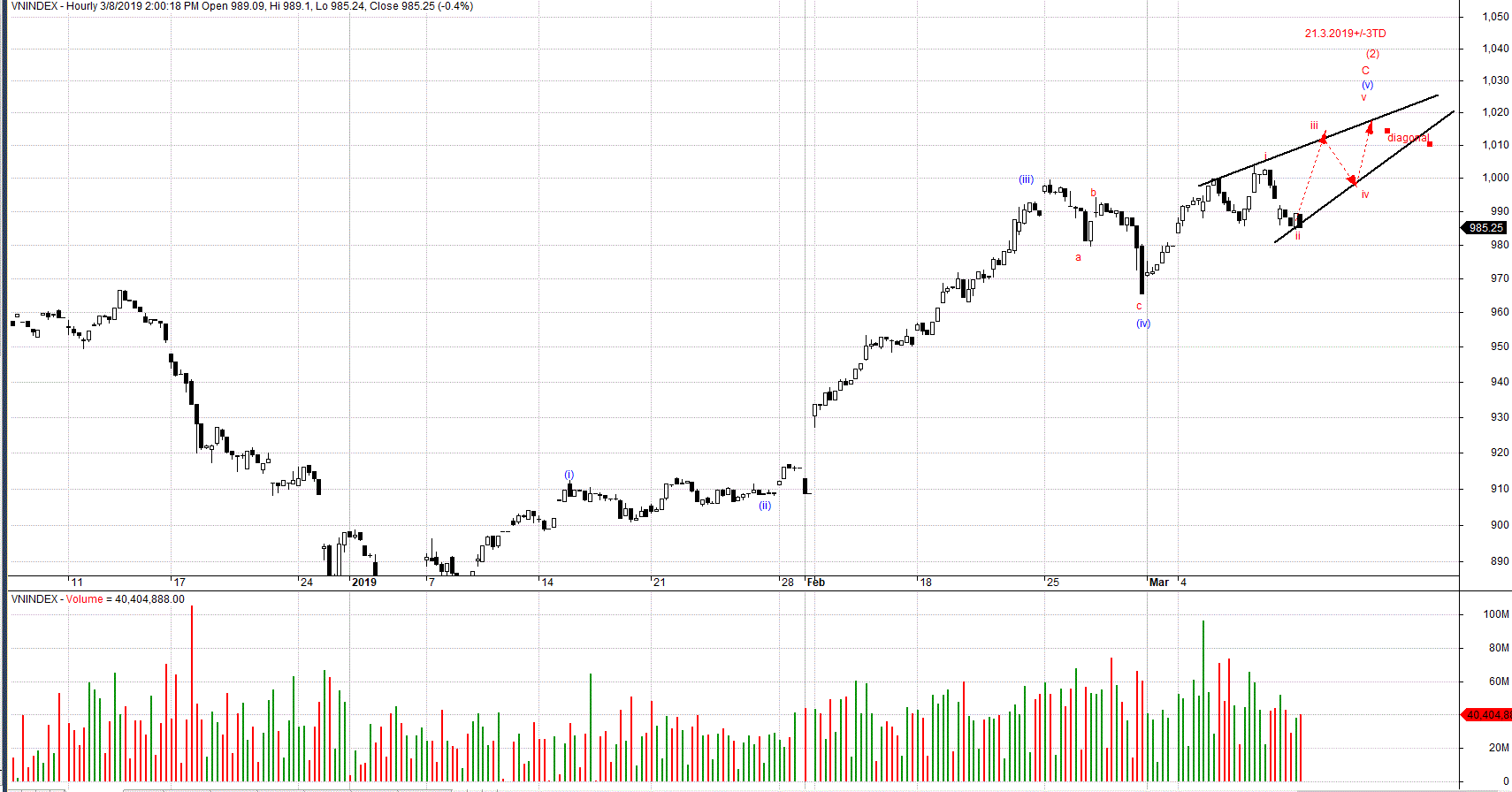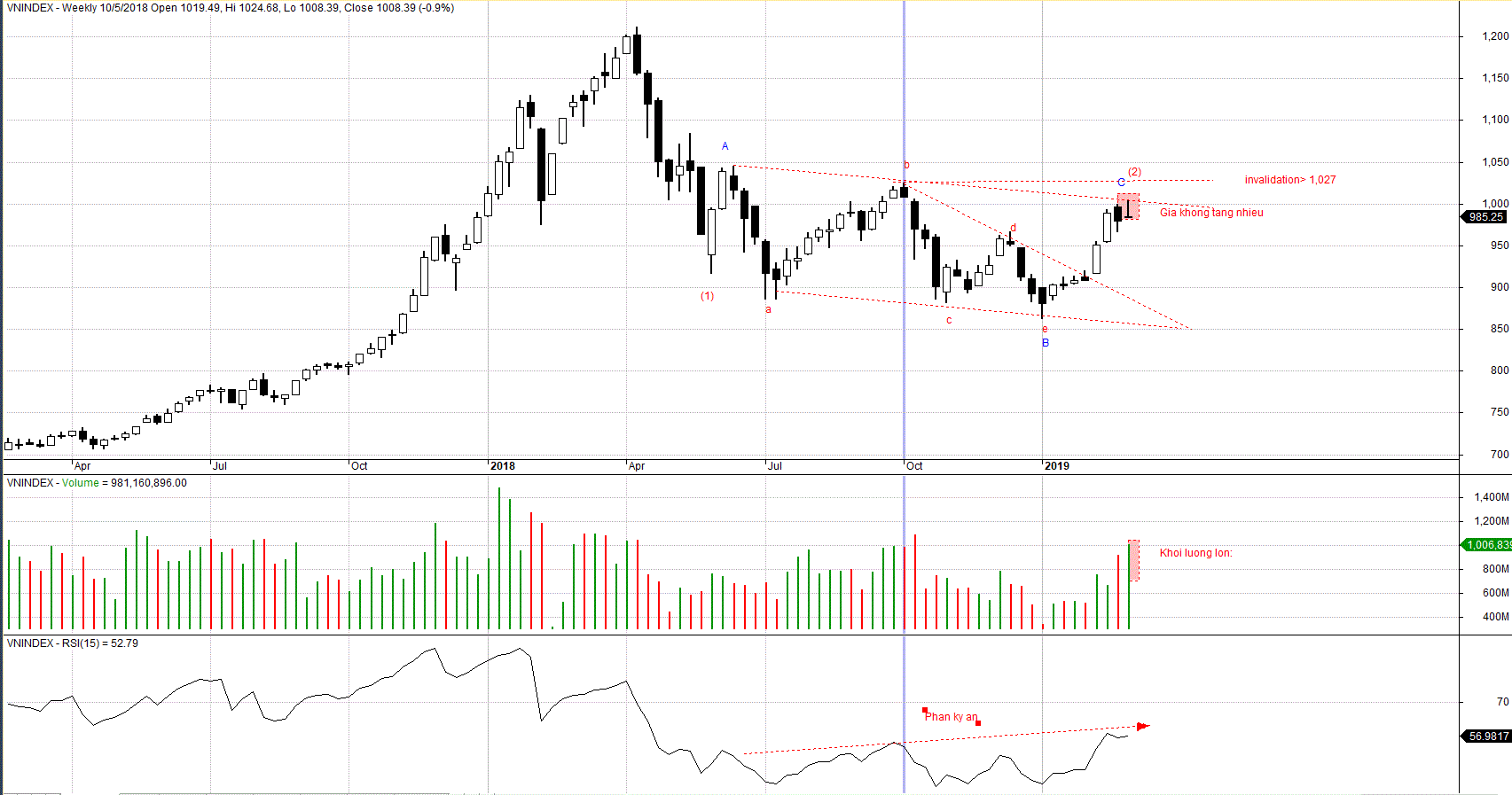 Trong trường hợp VN-Index cố kéo lên thì dạng sóng chéo (diagonal) có thể xuất hiện. Mức đỉnh tối đa của sóng chéo theo ước tính của tôi là 1020 điểm. Vùng thời gian đảo chiều cao nhất là 15.3-21.3.2019.