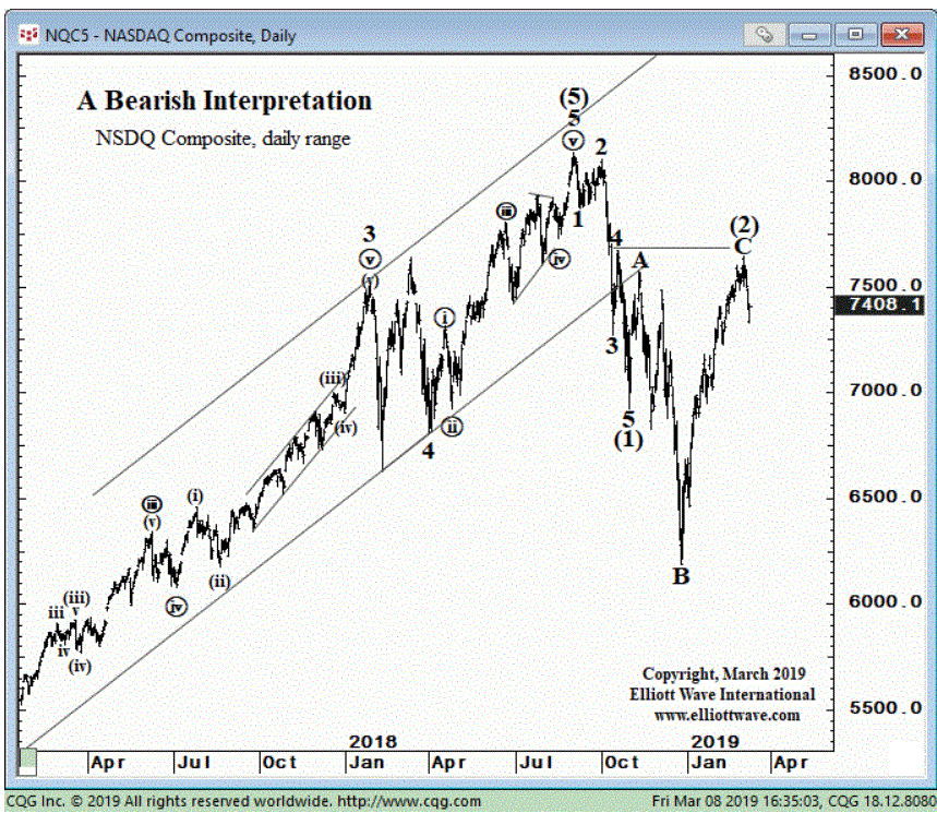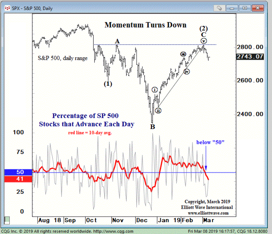 Theo báo cáo phân tích sóng Elliott từ công ty Elliott Wave International (EWI), kịch bản sóng Elliott hiện tại cho S&P500 là như sau. Sóng (2) đang có dạng bất bình thường (xem chi tiết về cấu trúc sóng dạng bất bình thường ở cuốn sách “Hướng Dẫn Giao Dịch Theo Sóng ELliott”). Trong đó, sóng C đã diễn ra đủ 5 sóng. từ i (vòng tròn) đến v (vòng tròn).