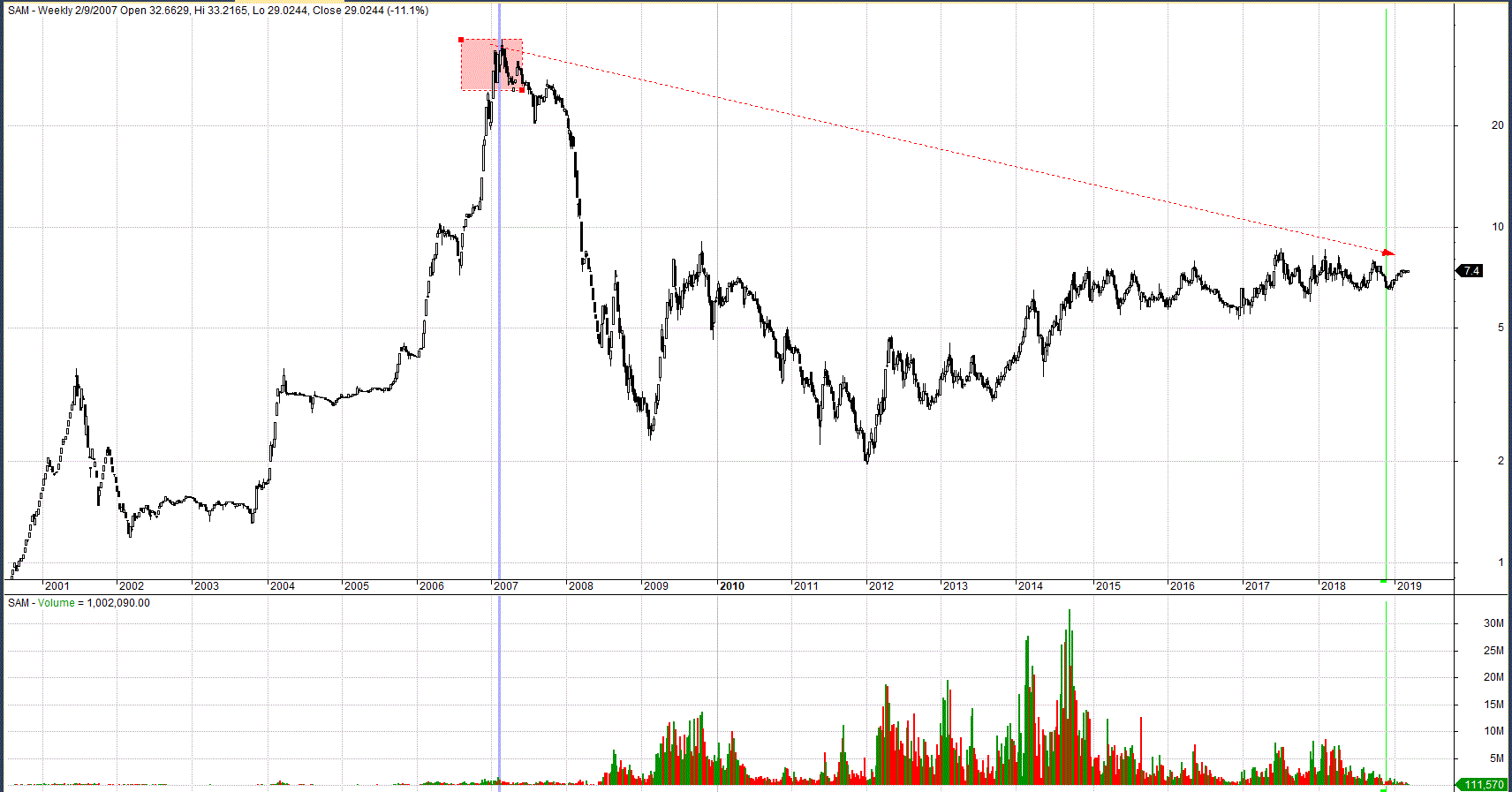 Đây không phải là câu chuyện hiếm đối với nhà đầu tư ở Việt Nam. Những nhà đầu tư từng trải sẽ biết rằng, SAM từng là siêu cổ phiếu ở Việt Nam khi mà cổ phiếu này là một trong hai cổ phiếu đầu tiên trên sàn chứng khoán Việt Nam. SAM hoạt động trong ngành cung cấp dây và cáp, từng là cổ phiếu đứng đầu trong ngành. Thế nhưng khi cáp quang đang thay thế dần cho cáp đồng, SAM dần đánh mất vị thế. Dữ liệu điều chỉnh cho thấy, những người mua ở đỉnh năm 2007 đang bị thua lỗ hơn 50% sau hơn 20 năm nắm giữa trong khi VN-Index đã vượt đỉnh cũ năm 2007 từ lâu.